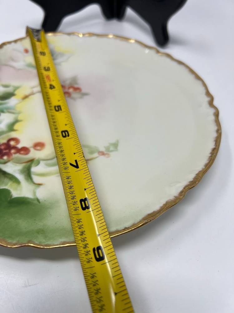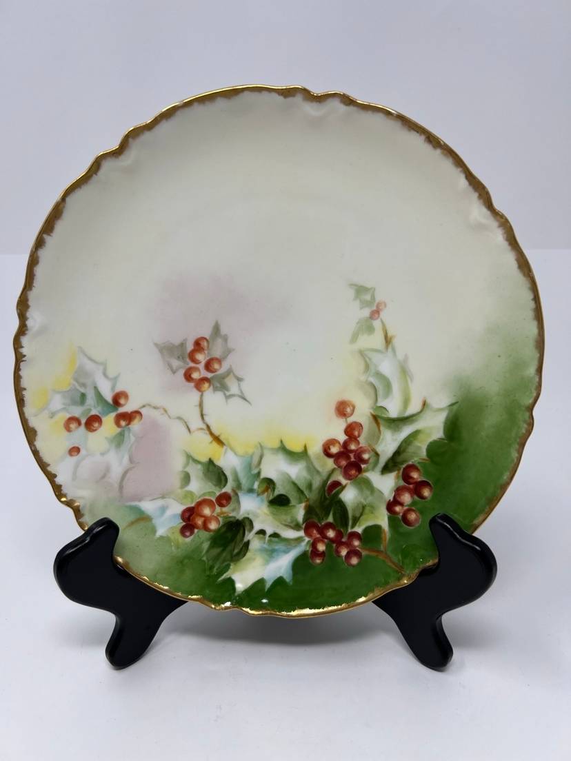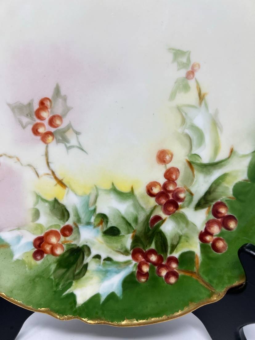 Add a touch of elegance to your dining table with this hand painted Haviland French Limoges Christmas Holly & Red Berries decorative plate. Crafted from high-quality porcelain, this plate features a stunning Christmas Holly pattern with a gold accent that will complement any festive table setting. Ideal for serving desserts or displaying as a decorative piece, this plate is a must-have for any collector or hostess. Whether you're hosting a holiday dinner party or simply enjoying a cup of tea, this plate is sure to impress.