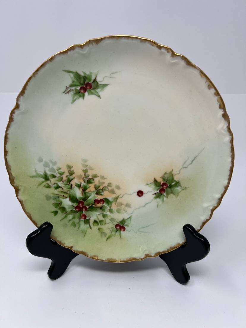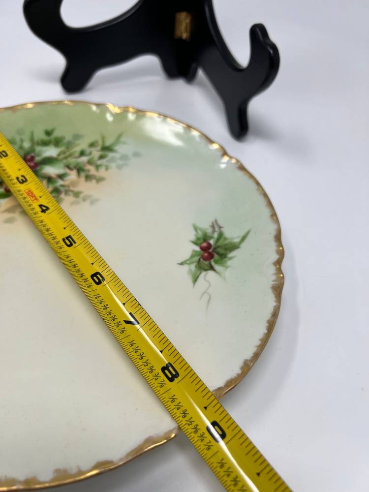 Add a touch of elegance to your dining table with this hand painted Haviland French Limoges Christmas Holly & Red Berries decorative plate. Crafted from high-quality porcelain, this plate features a stunning Christmas Holly pattern with a gold accent that will complement any festive table setting. Ideal for serving desserts or displaying as a decorative piece, this plate is a must-have for any collector or hostess. Whether you're hosting a holiday dinner party or simply enjoying a cup of tea, this plate is sure to impress.