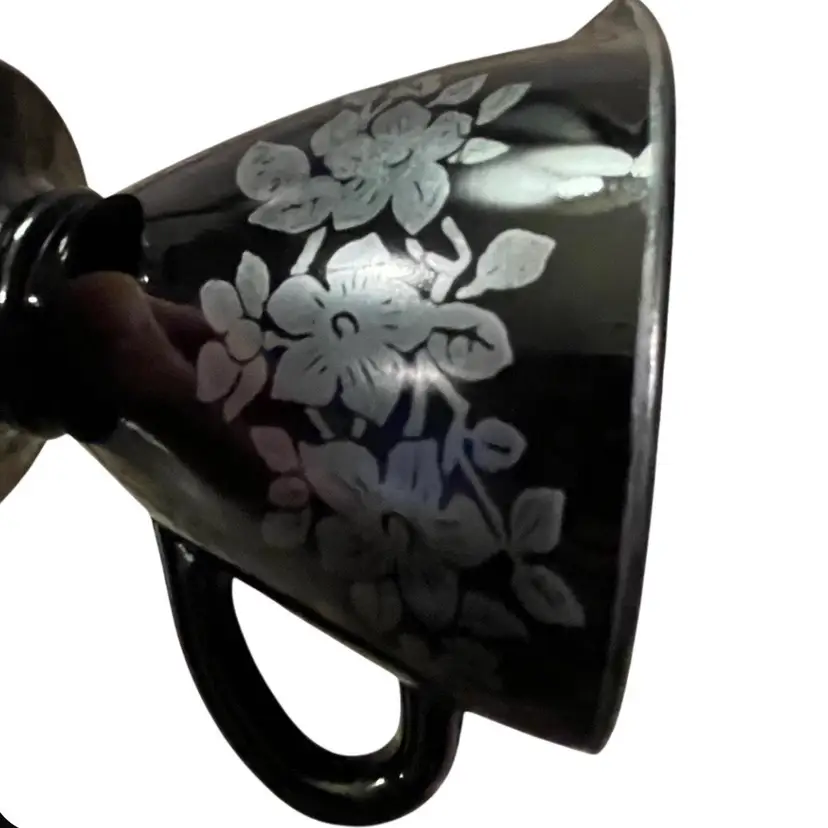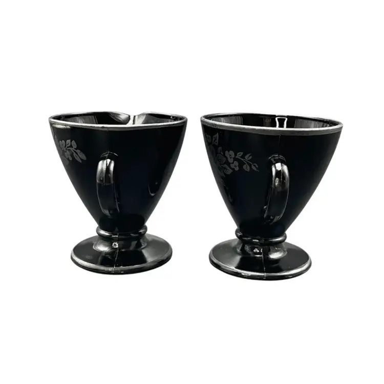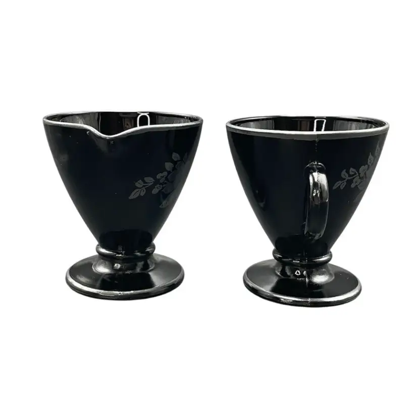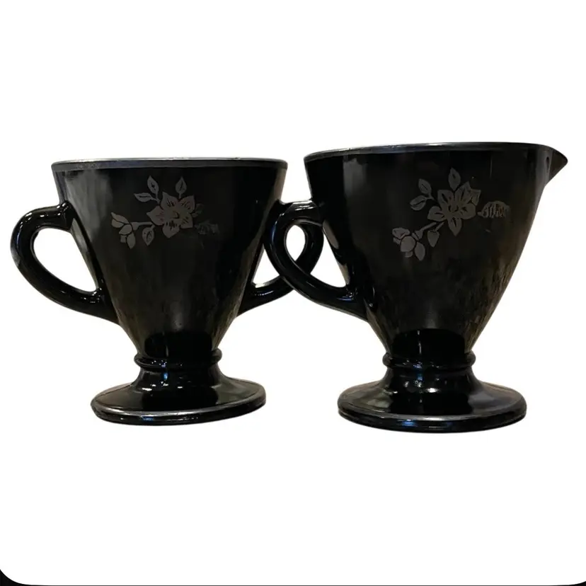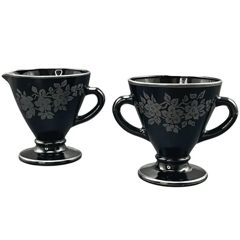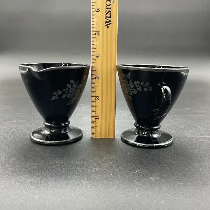 This is a set of 2 vintage Hazel Atlas Ovide black depression glass with sterling silver overlay cream and sugar set. Each measure approximately 3.5" tall. The creamer measures approximately 3.5" across, and the sugar measures approximately 3" across. There is a nick in the silver on the rim of the creamer right above the handle as shown in pictures. No other major flaws.