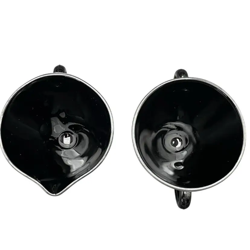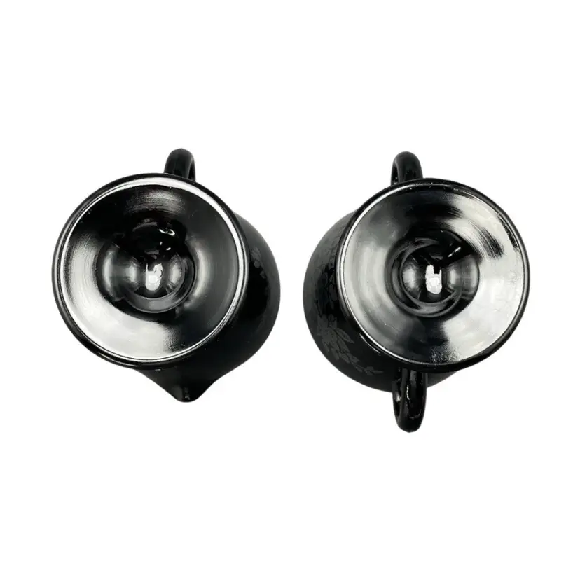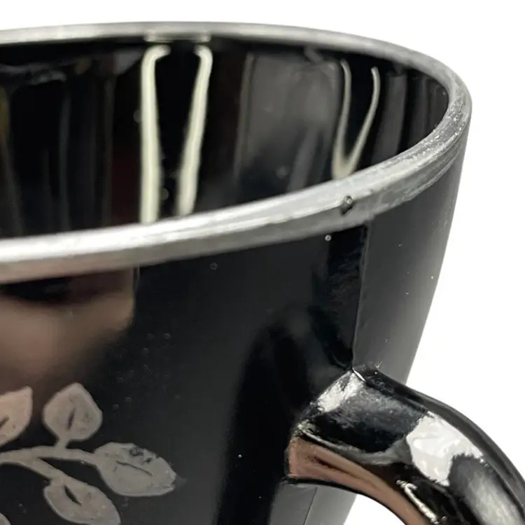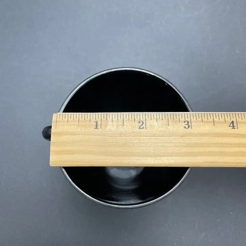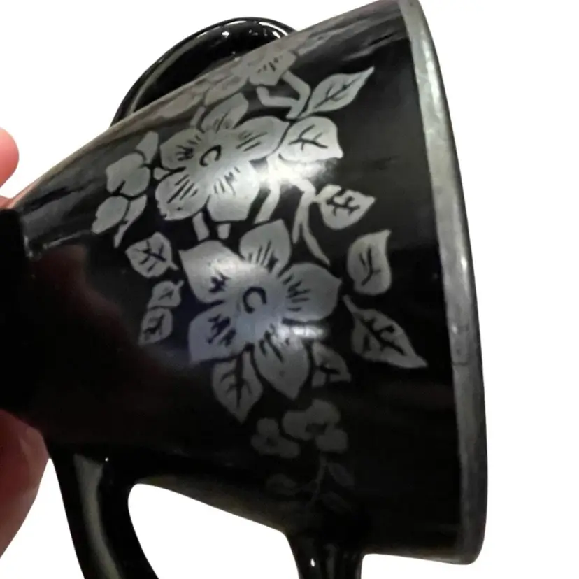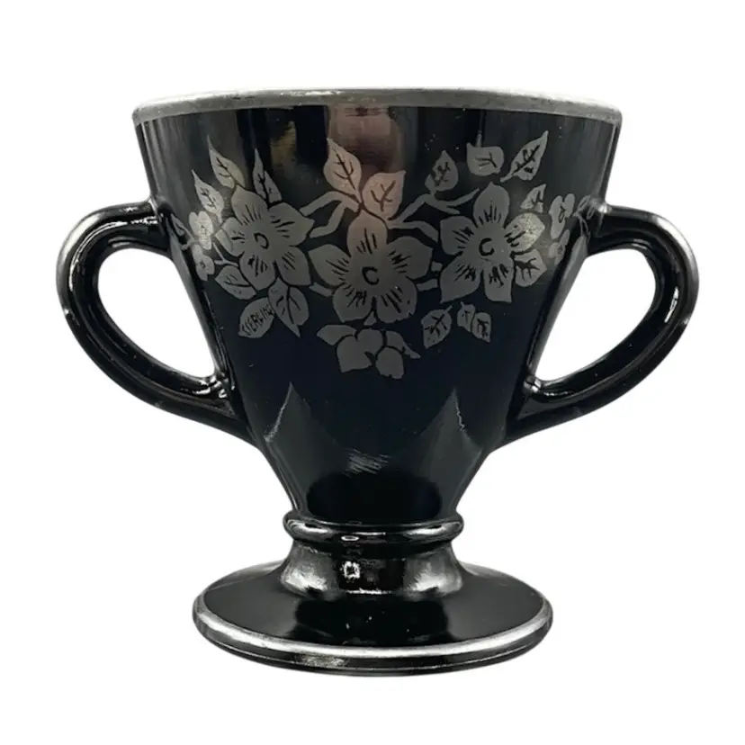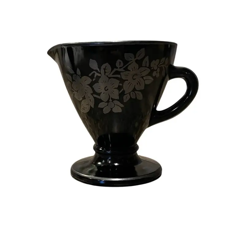 This is a set of 2 vintage Hazel Atlas Ovide black depression glass with sterling silver overlay cream and sugar set. Each measure approximately 3.5" tall. The creamer measures approximately 3.5" across, and the sugar measures approximately 3" across. There is a nick in the silver on the rim of the creamer right above the handle as shown in pictures. No other major flaws.