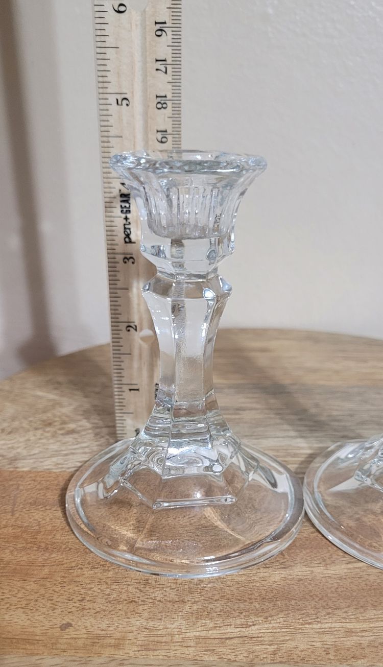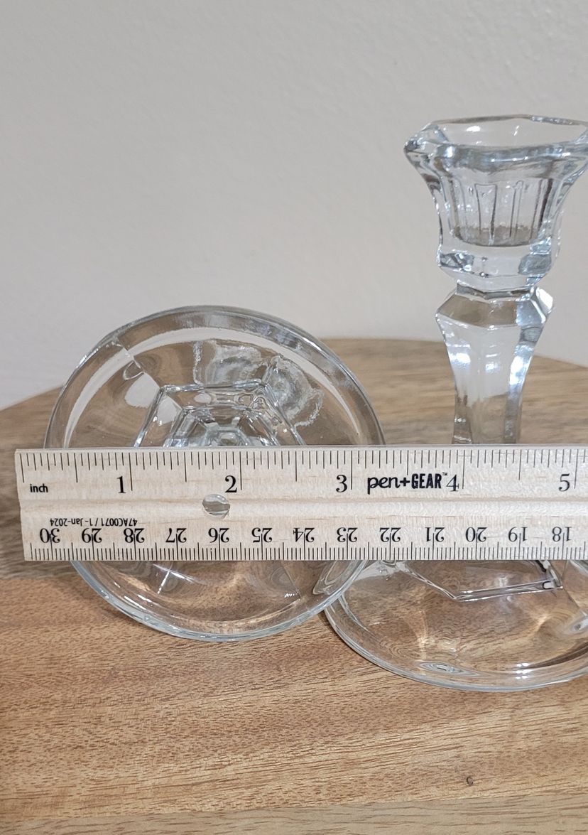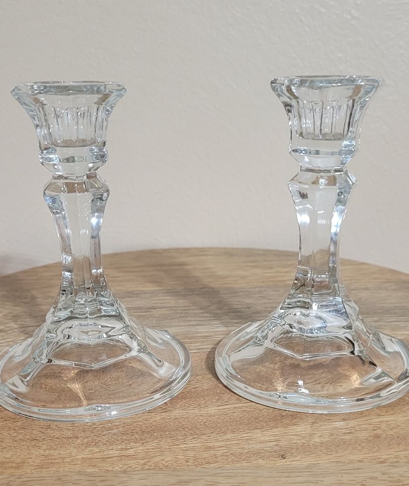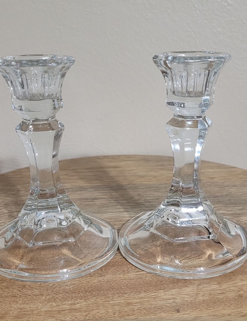 This set of two heavy clear glass candlestick holders adds a touch of elegance and sophistication to any space. Made of sturdy glass, these holders are designed to securely hold and display candles in a stylish way. The clear color allows the light from the candles to shine through, creating a warm and inviting ambiance. Perfect for home decor or as a decorative collectible for any room.