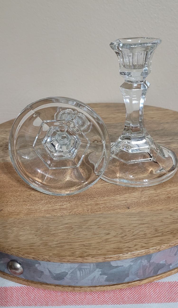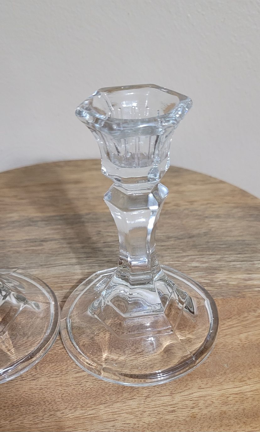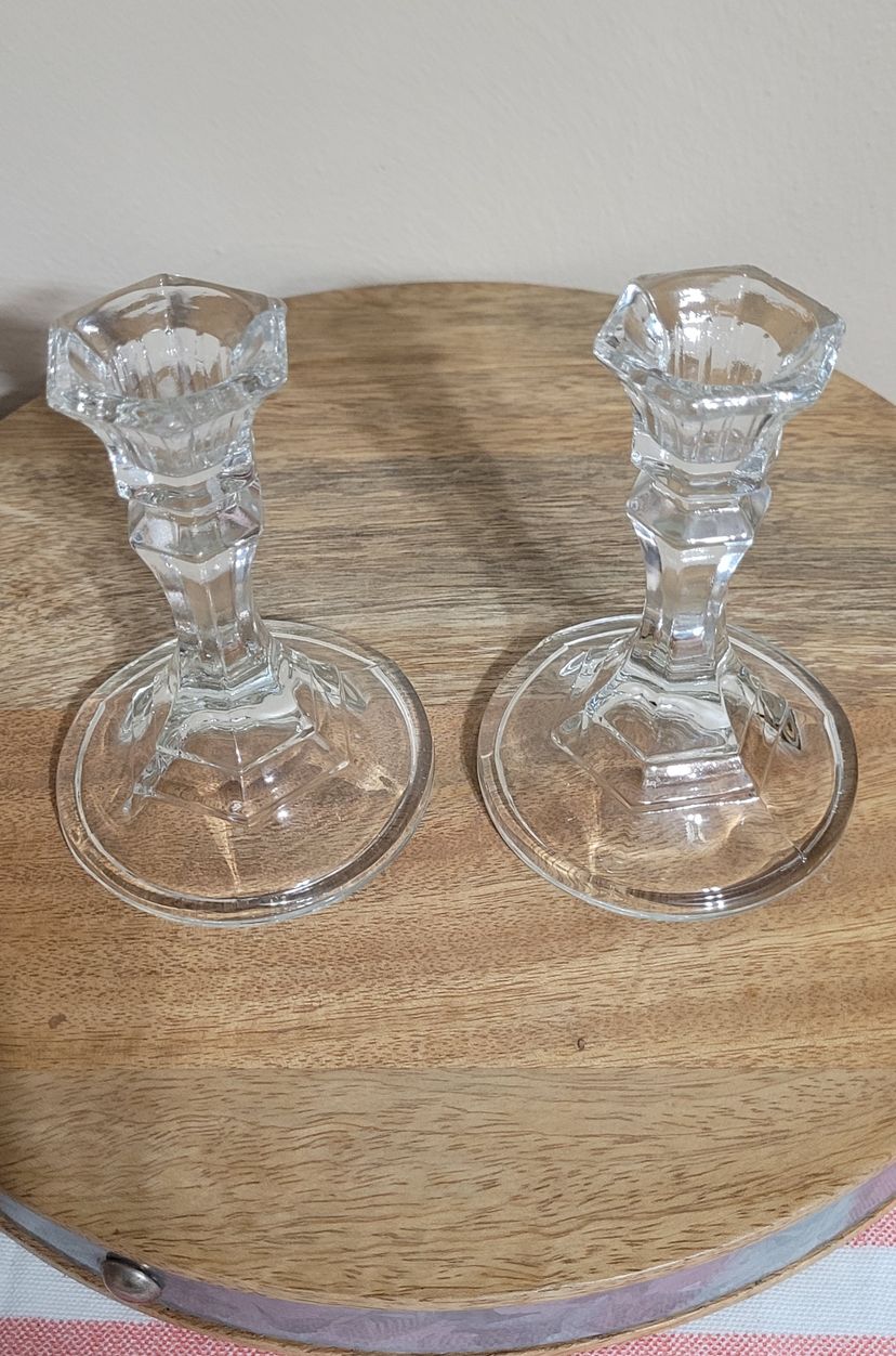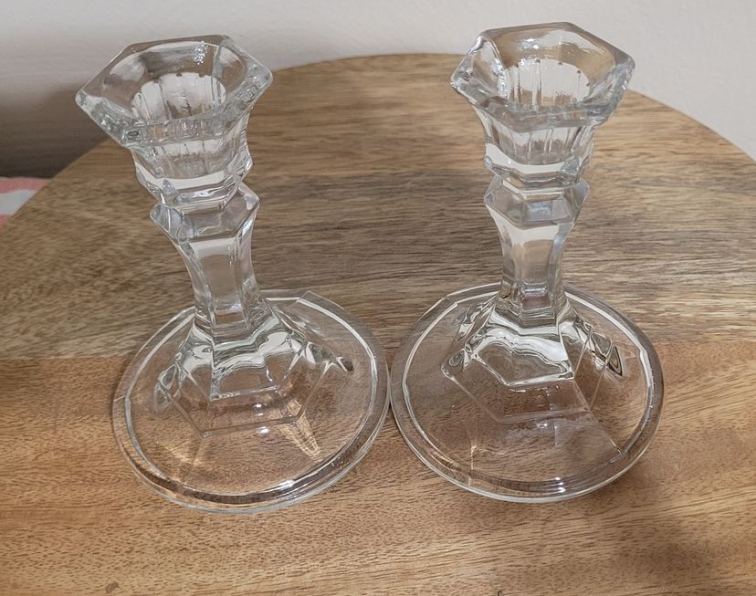 This set of two heavy clear glass candlestick holders adds a touch of elegance and sophistication to any space. Made of sturdy glass, these holders are designed to securely hold and display candles in a stylish way. The clear color allows the light from the candles to shine through, creating a warm and inviting ambiance. Perfect for home decor or as a decorative collectible for any room.