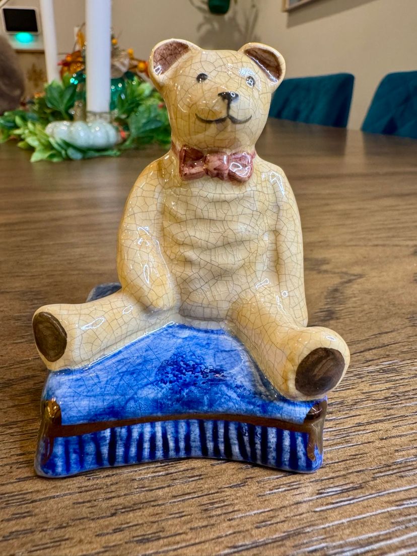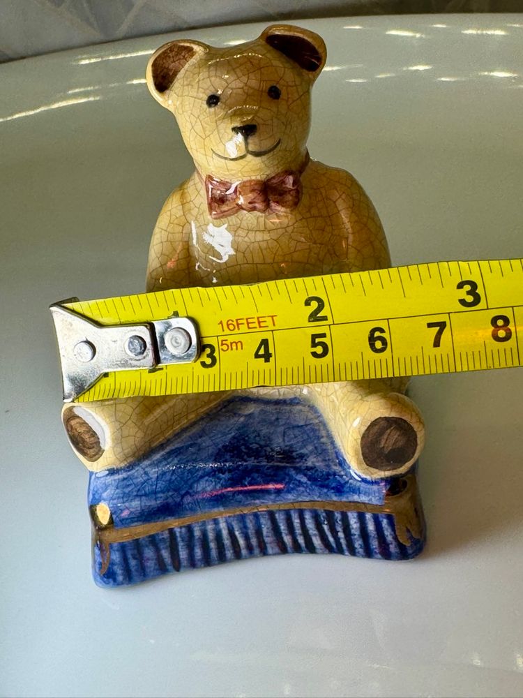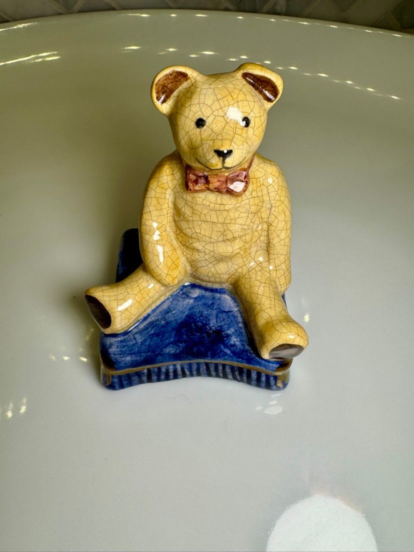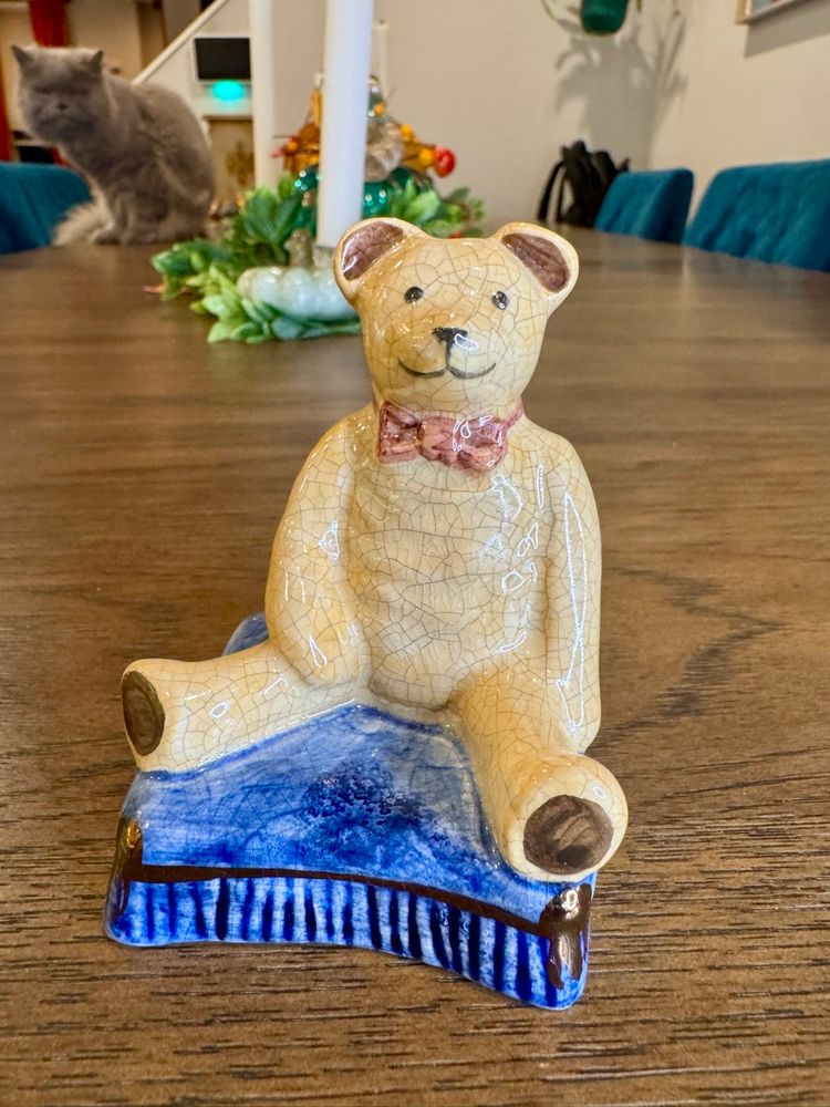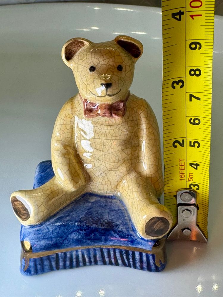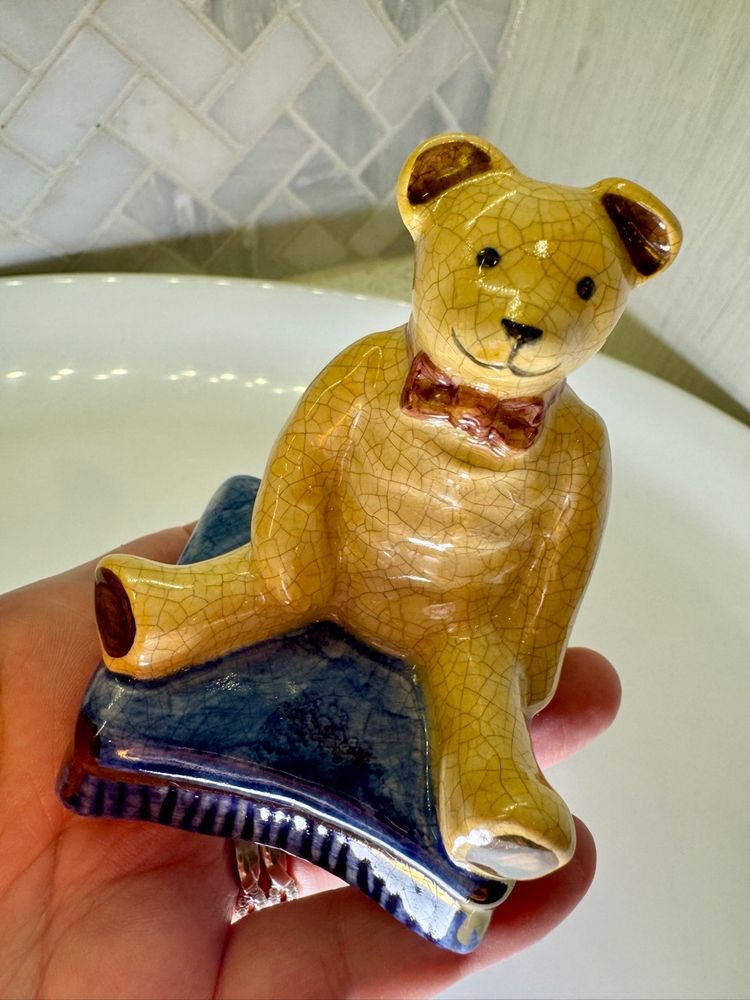 This is a vintage porcelain teddy bear figurine, from Staffordshire, England. It is sitting on a blue book and has a crackled finish. 3.5x2 inches