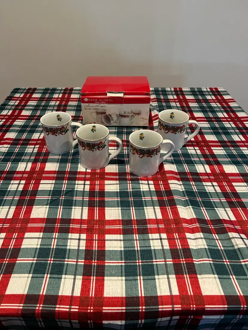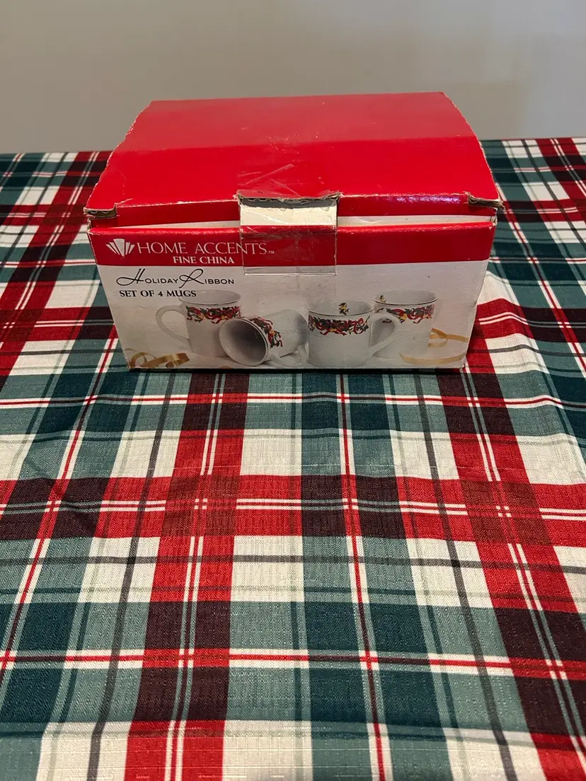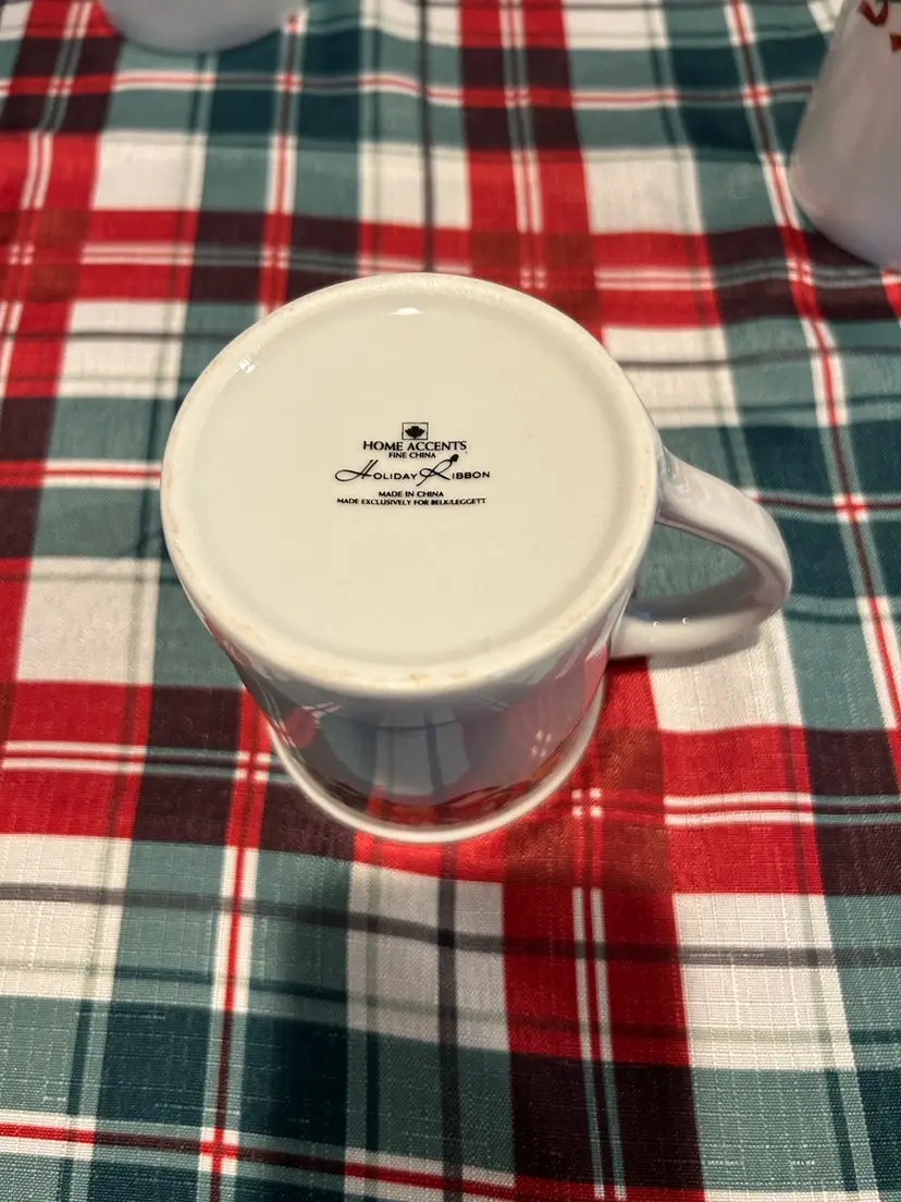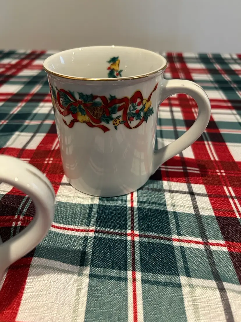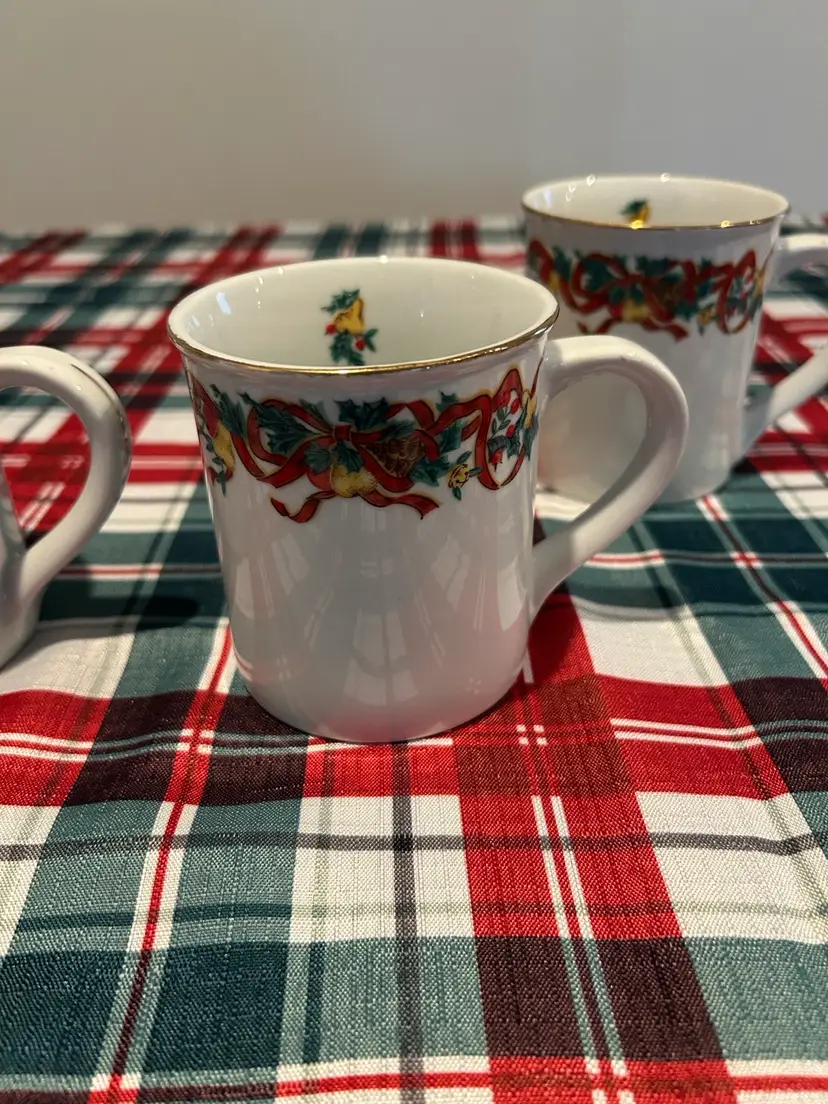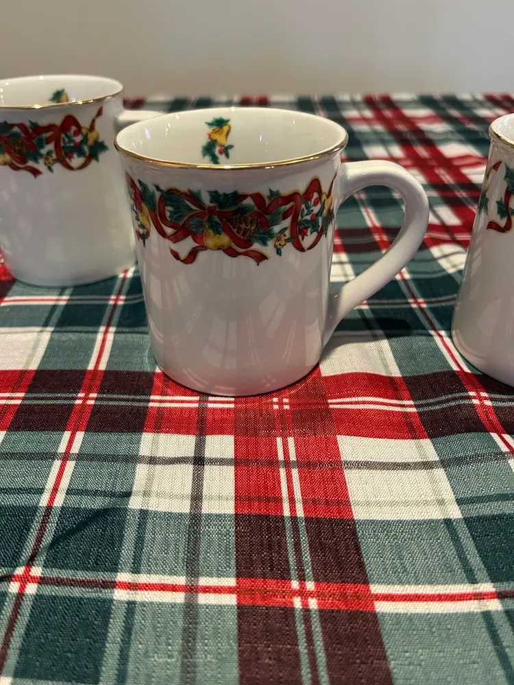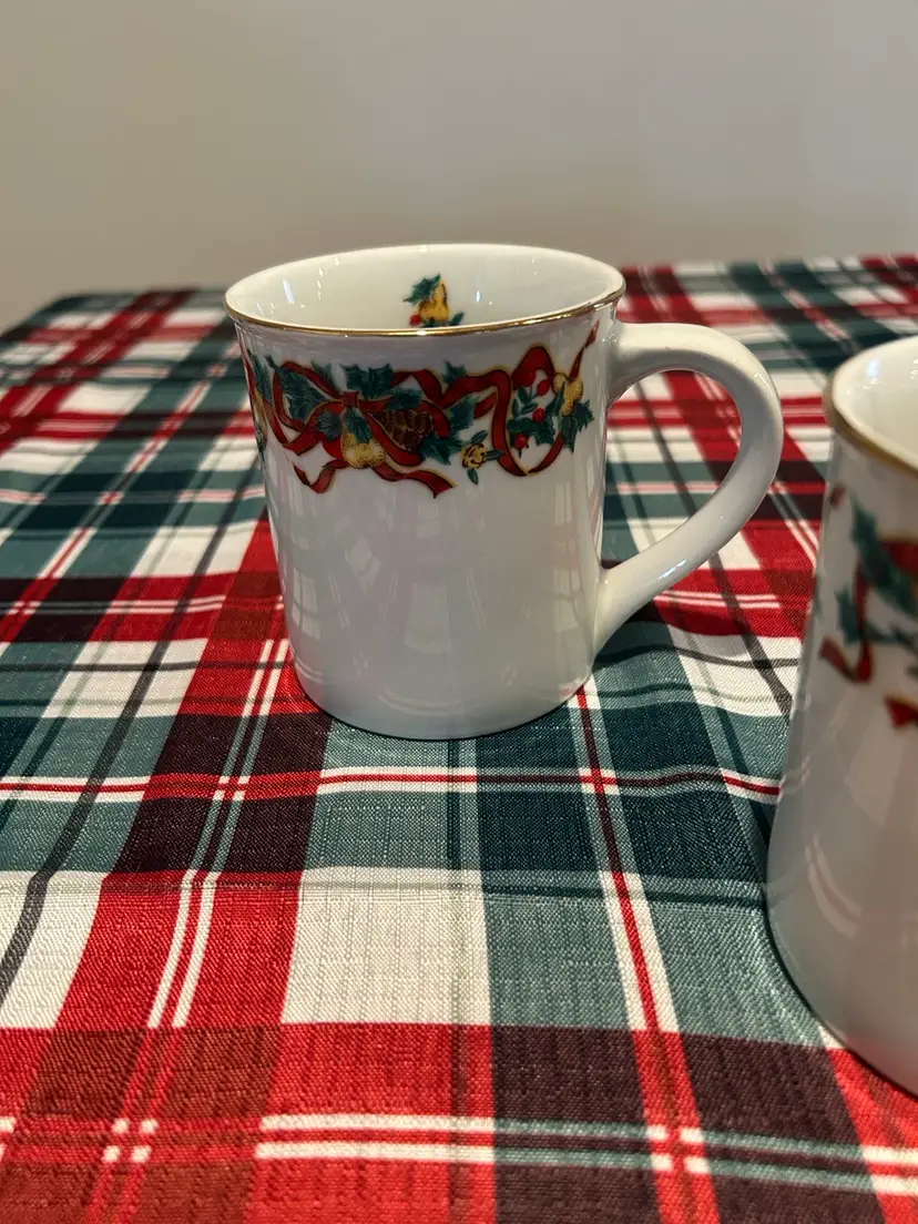 Enhance your Christmas with this elegant set of Christmas ribbon patterned white mugs. Perfect for your holiday decor. 3.5 high 3.25 diameter