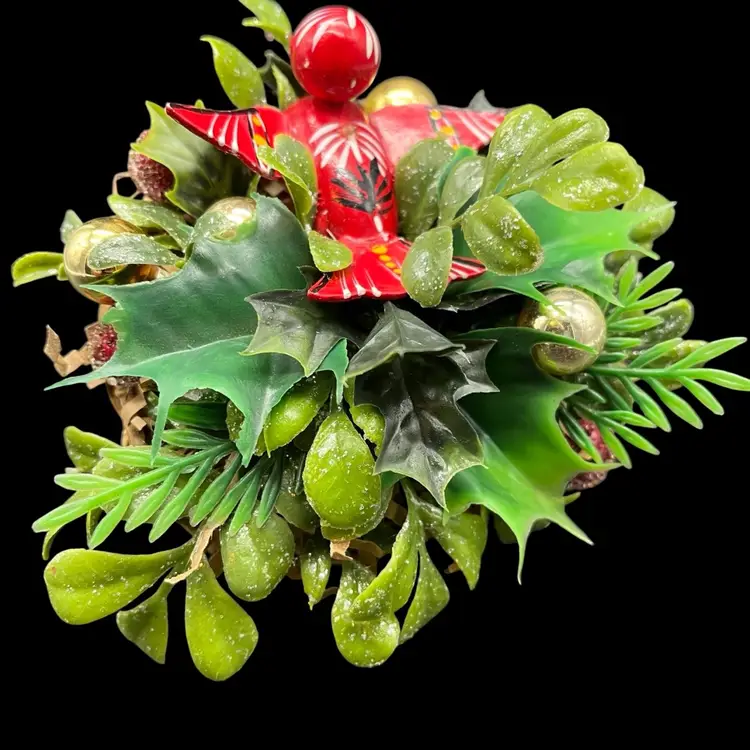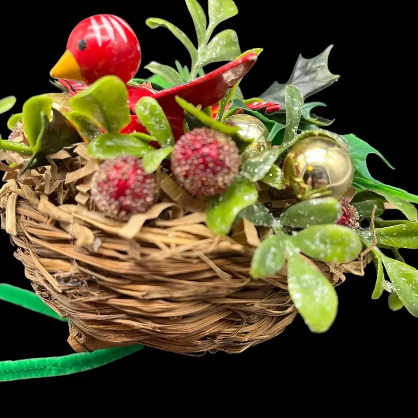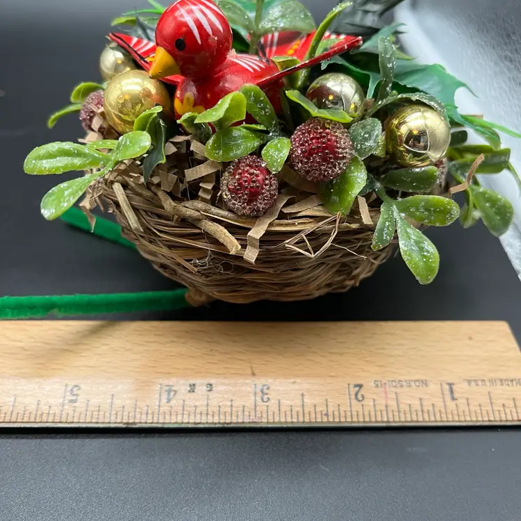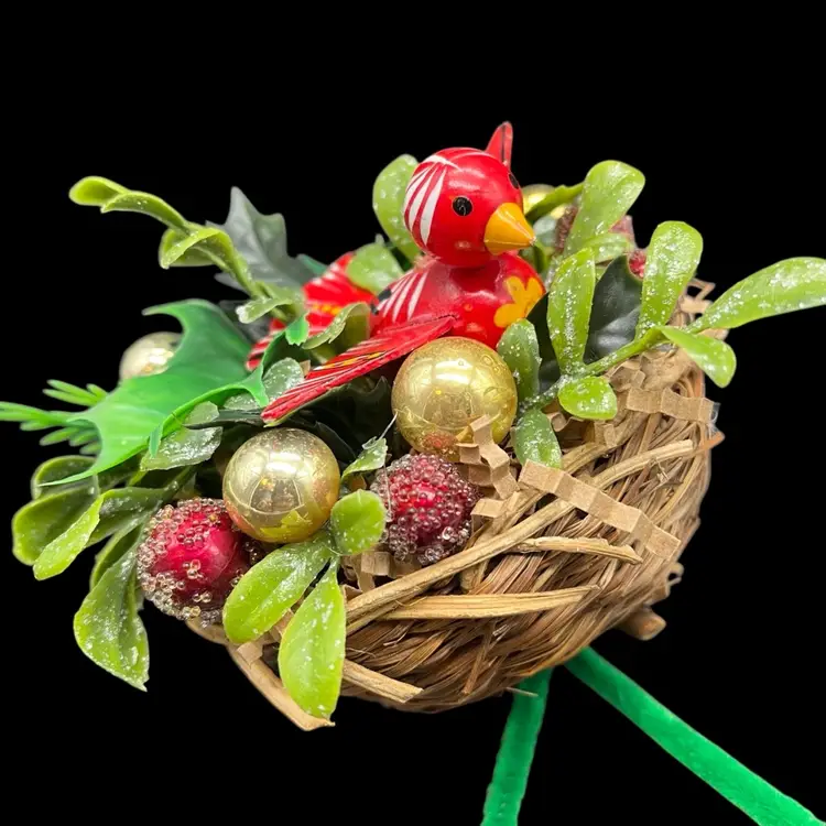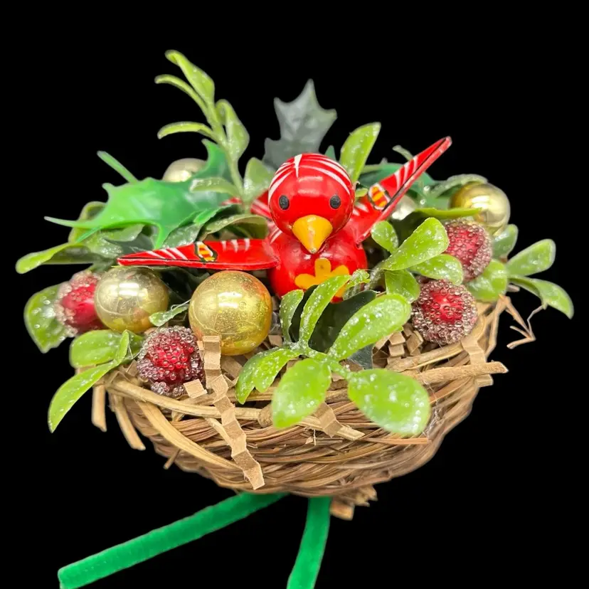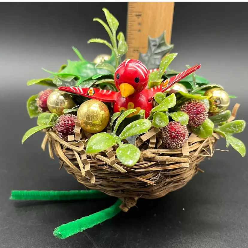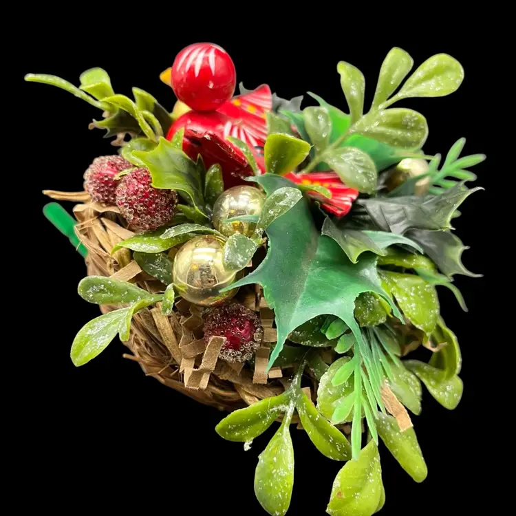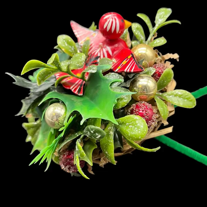 All upcycled items - vintage wood bird, kitschy plastic, mercury glass ornaments.