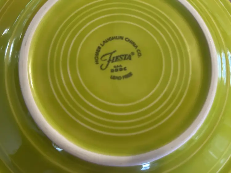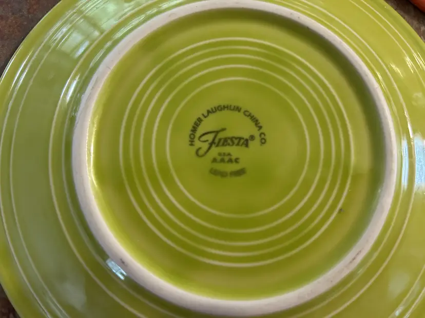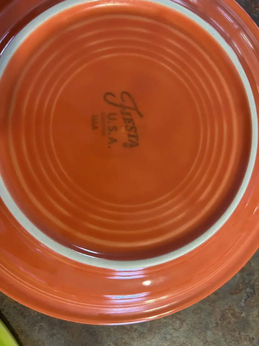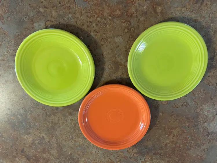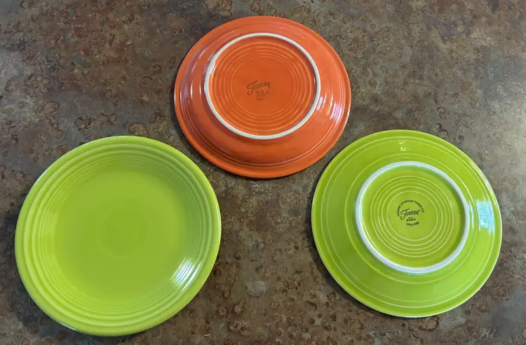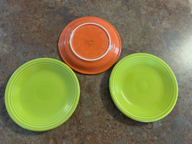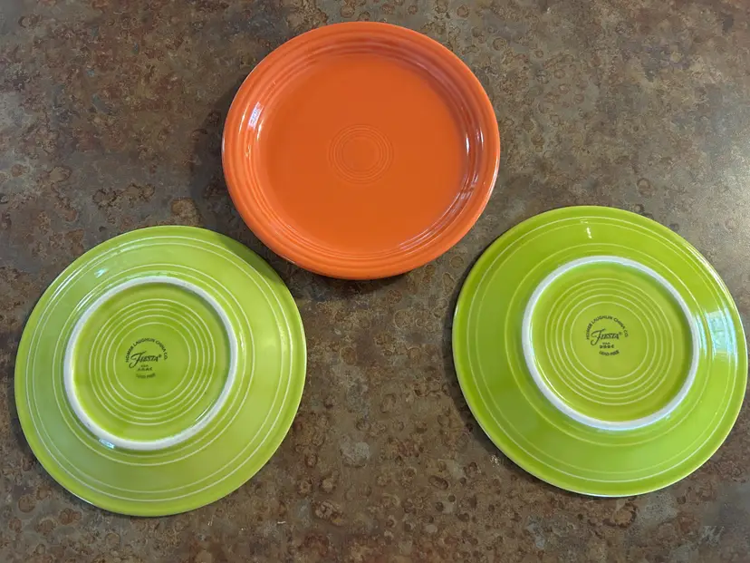 Homer Laughlin Fiesta Ware Set of 3 plates. Approximately 7" round Two Lemongrass Green One Salmon