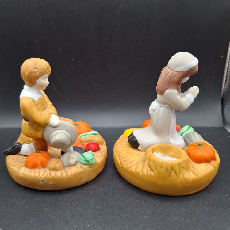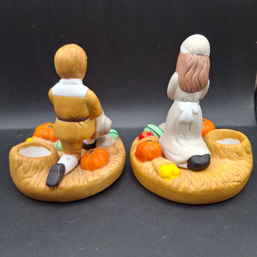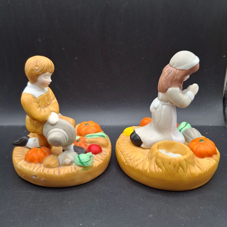 In a quaint village, these charming pilgrim boy and girl candle holders evoke the spirit of Thanksgiving. The duo, surrounded by bountiful harvests of pumpkins and vegetables, kneels in heartfelt prayer. Crafted with intricate details, they offer a nostalgic glimpse into a cherished tradition, inviting warmth and grace to your holiday table.