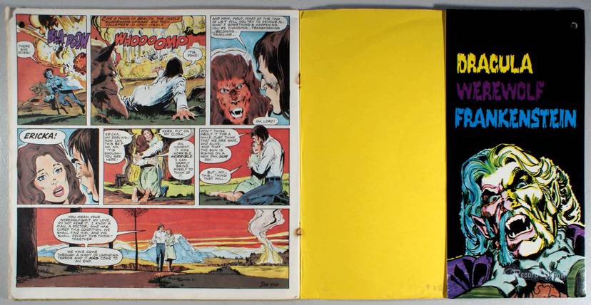 Sleeve has attached comic book about Dracula, Wolfman, and Frankenstein. Vinyl plays nicely; occasional light-crackles near be beginning of each side (play-graded). Double LP. Gate-fold cover looks good; a few creases near edges; very light-scuffing (front/back/inner-gate); surface impressions. Inner-sleeves are original (generic white). Spine shows mild-wear. Minor shelf-wear along top/bottom-edge, some wear to corners. Opening is crisp with signs of light use. (Hole-punch in corner.)