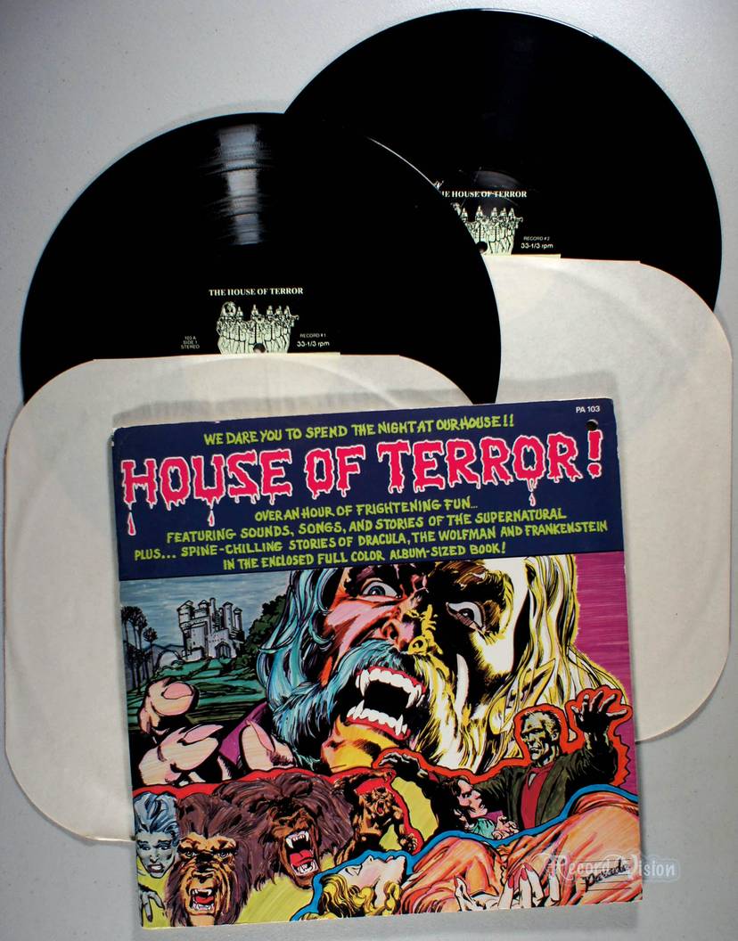 House of Terror! is over an hour of frightening fun featuring sounds, songs, and stories of the supernatural plus – spine chilling stories of Dracula, Wolfman, and Frankenstein in the enclosed full color album-sized comic book!