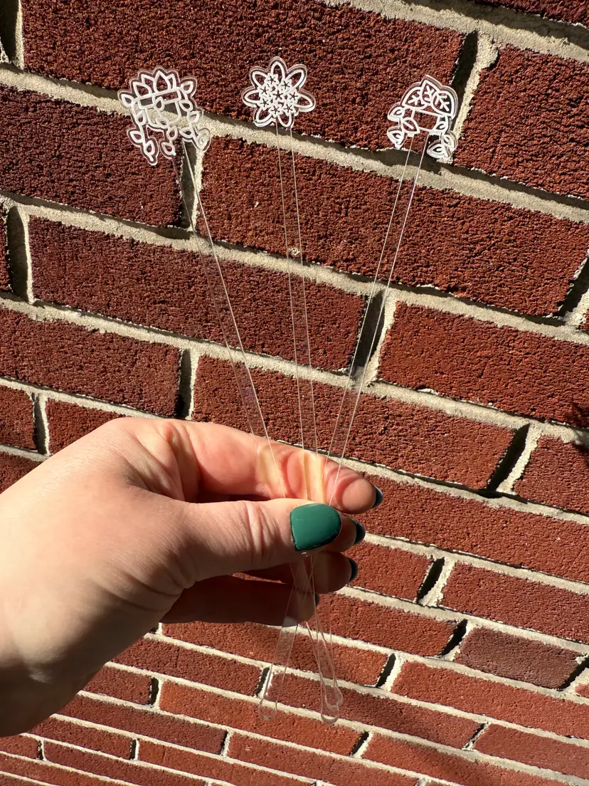 Details: 🪴 9” tall and 1/8” thick 🪴 3-pack includes one of each design 🪴 3-pack includes one of each design 🪴 .2” wide stem 🪴100% clear cast acrylic