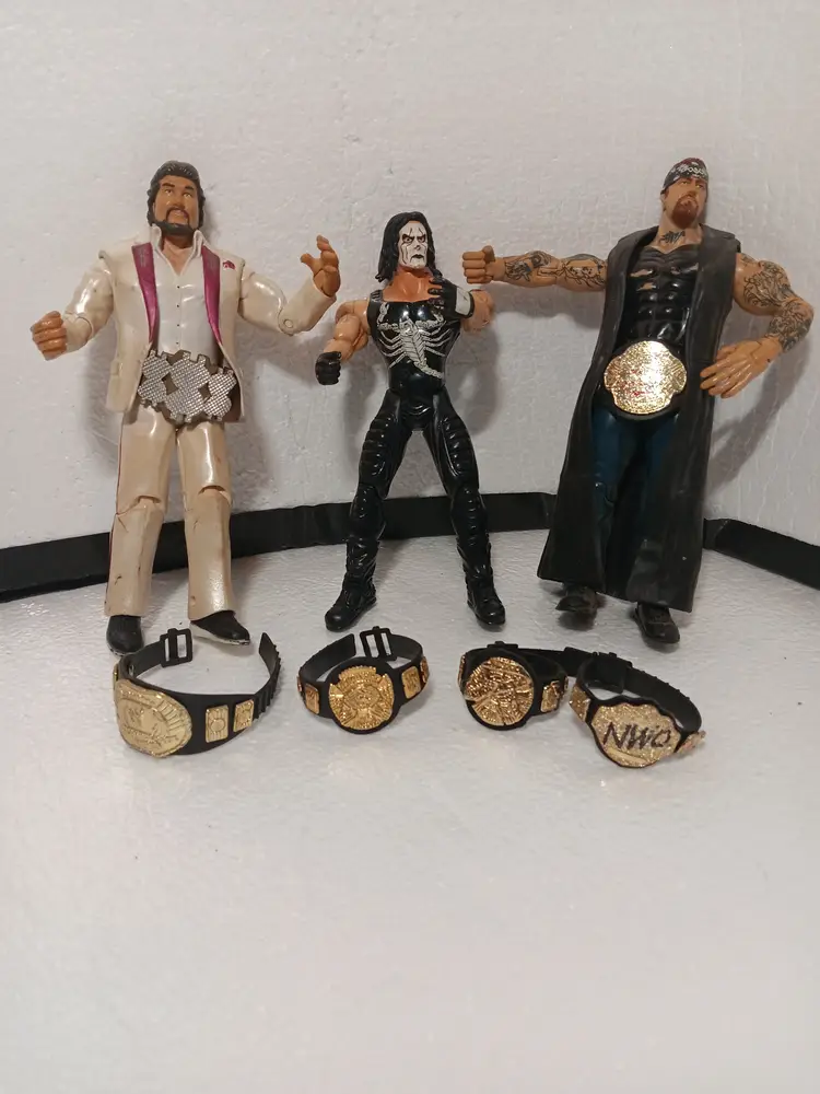 This HUGE lot of wrestling stuff includes everything pictured. The packaging of the figures is not in the best shape.
