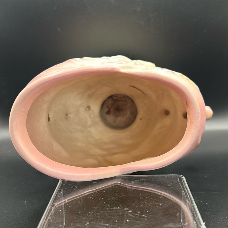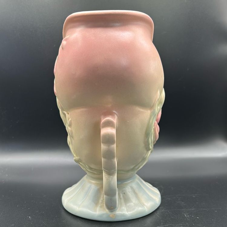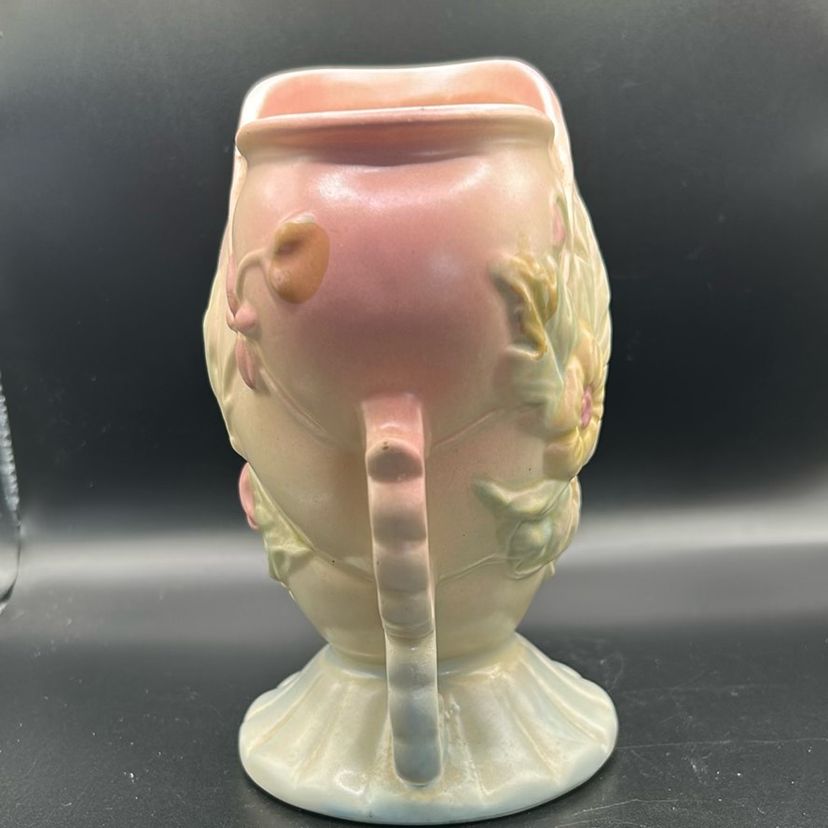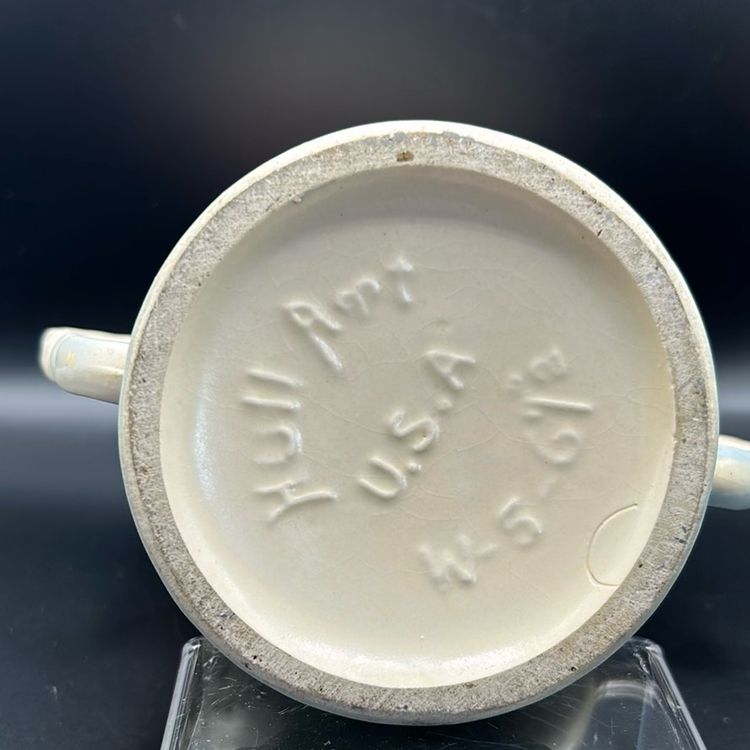 This piece is a Hull art pottery vase. It is the W56 model featuring a double handle design. It is a piece of Hull’s wildflower series. It stands just over 6 inches tall and is approximately 5 1/2 inches wide. There are no chips or cracks