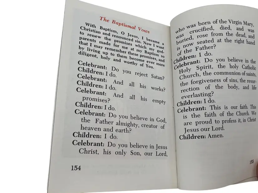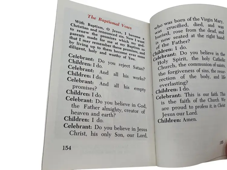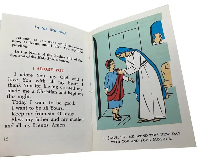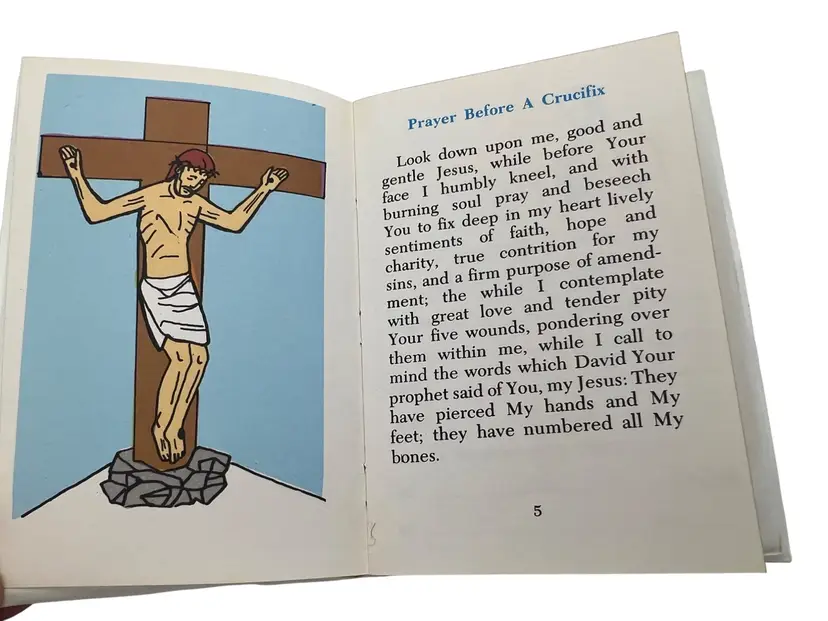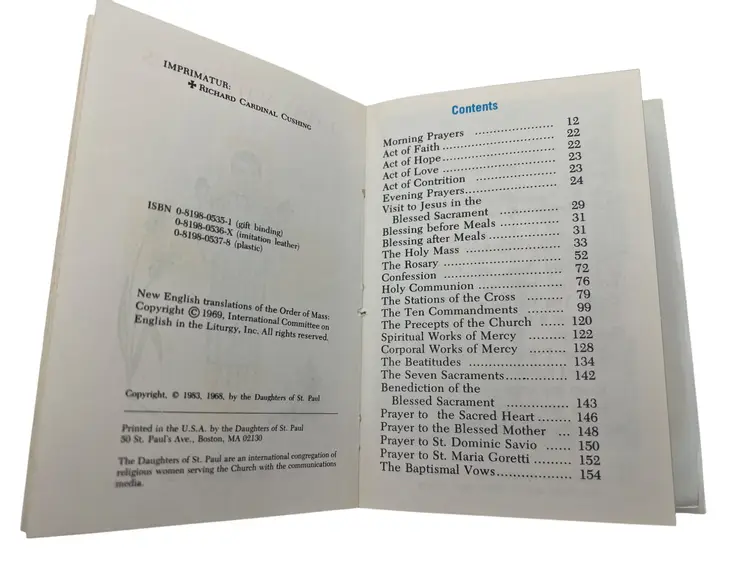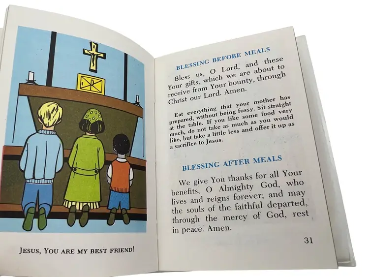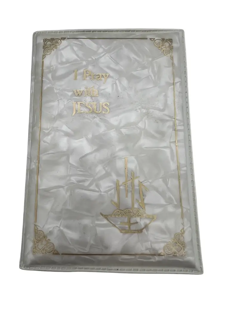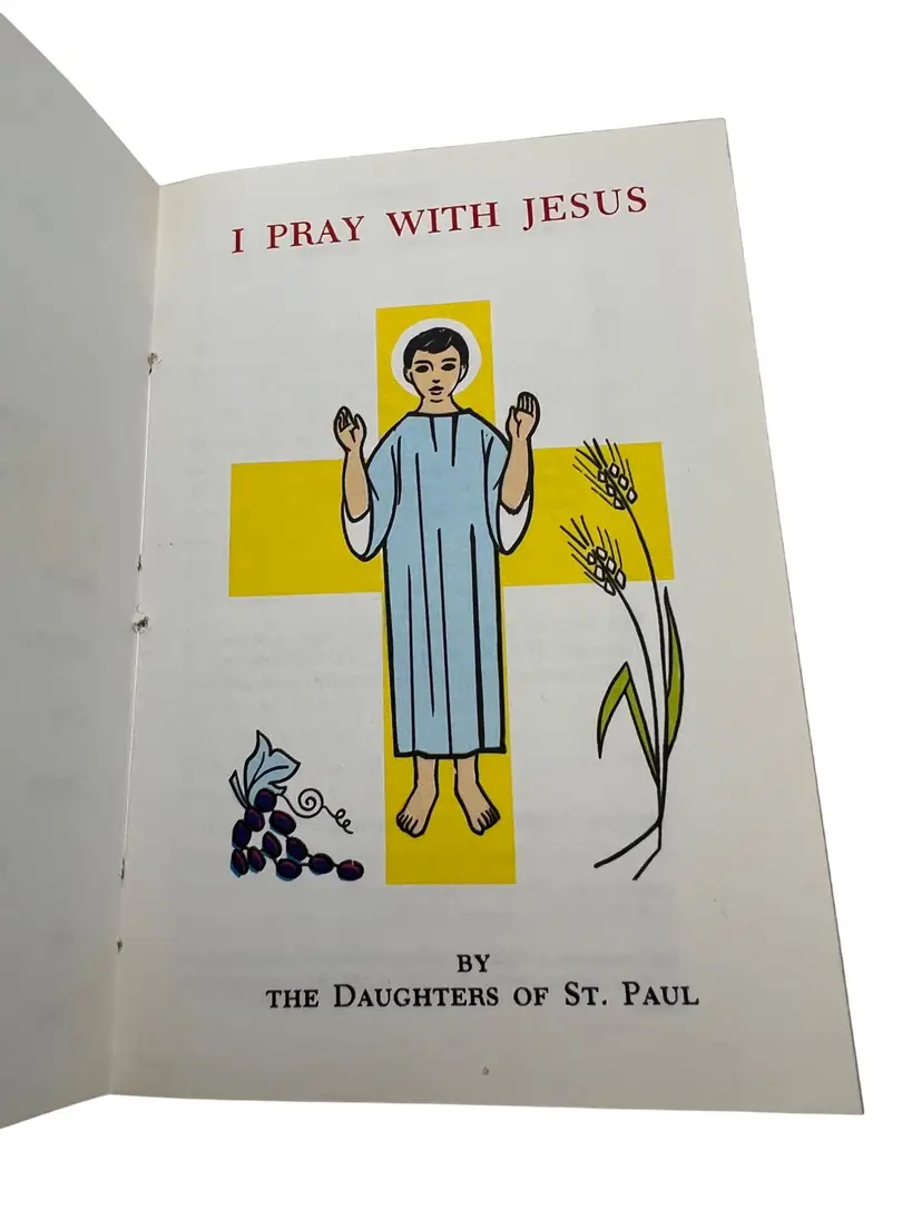 Small illustrated Catholic prayer book for children: I Pray With Jesus by the Daughters of St. Paul. Pearlized soft plastic gift cover (celluloid look). Measures approximately 5.25" x 3.5"; 155 numbered pages. Includes morning/evening prayers, the Mass, Rosary, Stations of the Cross, Ten Commandments, Seven Sacraments, Works of Mercy, Beatitudes, and more. Imprimatur Richard Cardinal Cushing; copyright 1968 & 1983; printed in the USA. ISBN 0-8198-0537-8 (plastic edition).
