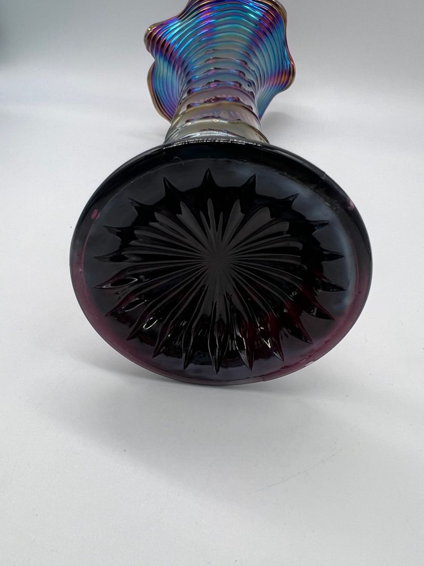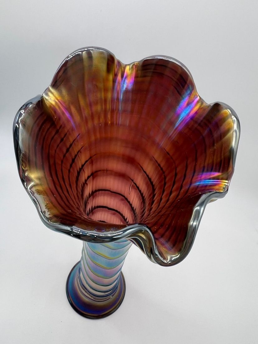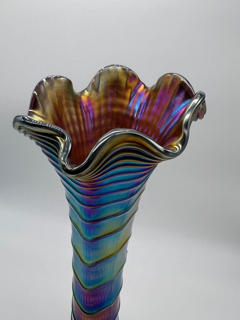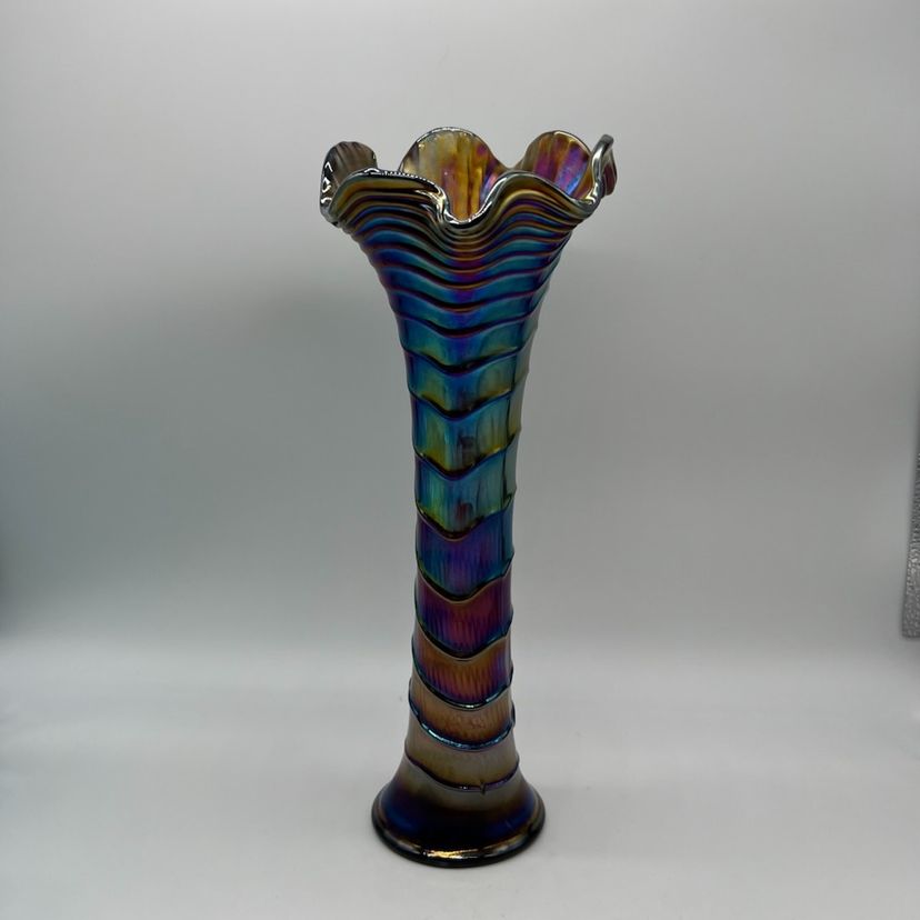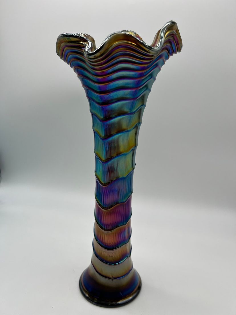This stunning Imperial Carnival Ripple Vase features a captivating design that showcases vibrant colors and intricate detailing. Standing at an impressive 13 inches tall, it makes for a striking centerpiece in any home decor. The ripple effect adds texture and depth, catching the light beautifully and creating a mesmerizing display. Perfect for showcasing flowers or as a standalone piece, this vase is a must-have for collectors and enthusiasts of fine glassware. Its classic yet contemporary style ensures it will complement a variety of interior themes, making it a versatile addition to your collection. Whether you're looking to enhance your own space or searching for a thoughtful gift, this vase is sure to impress.