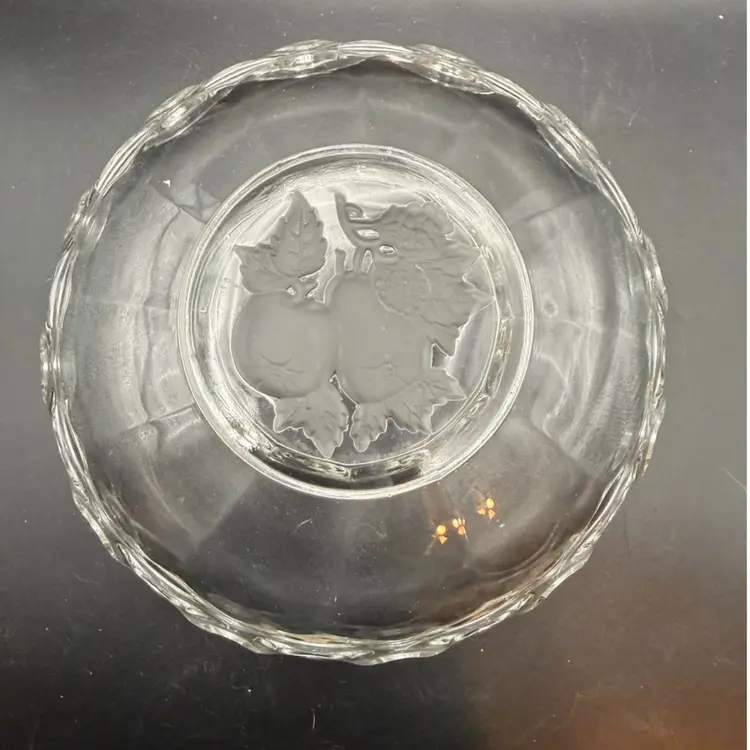 This particular Imperial Glass piece, with its "crocheted lace" edge and fruit motif, is characteristic of the decorative pressed glass popular in American homes from the 1930s through the 1960s.