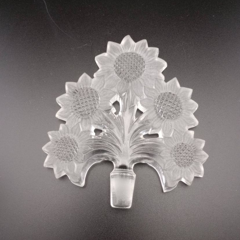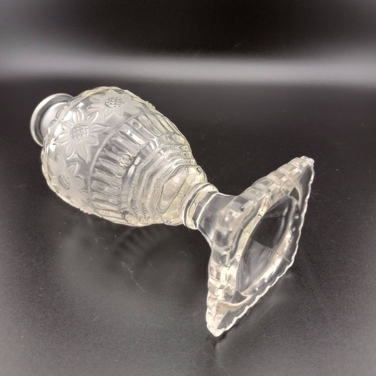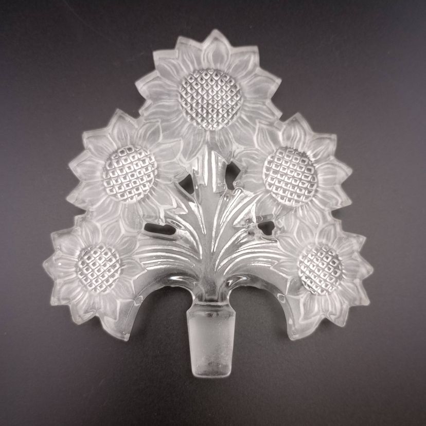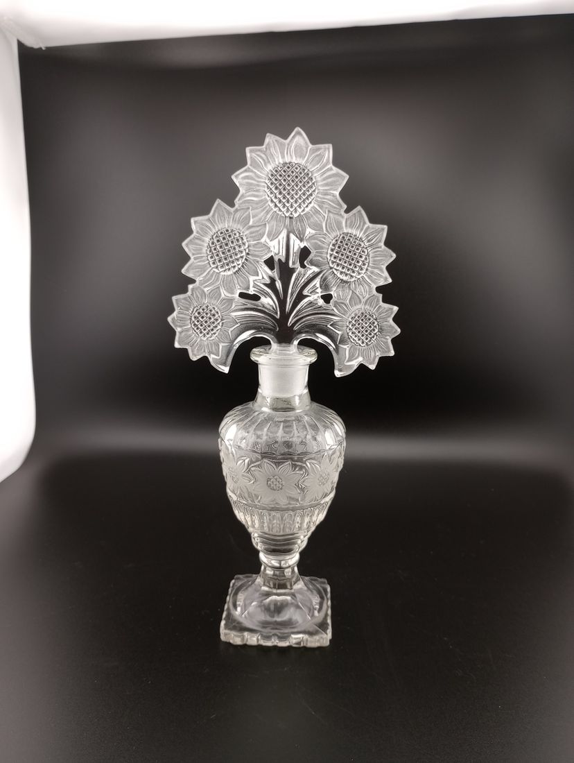 This piece is spectacular. A vintage perfume/cologne bottle from Imperial Glass in a sunflower pattern. The stopper is an amazing spray of sunflowers, carved on one side, flat on the other. At over 10" tall, it makes quite a statement. It's in good vintage condition with a chip on one of the petals.