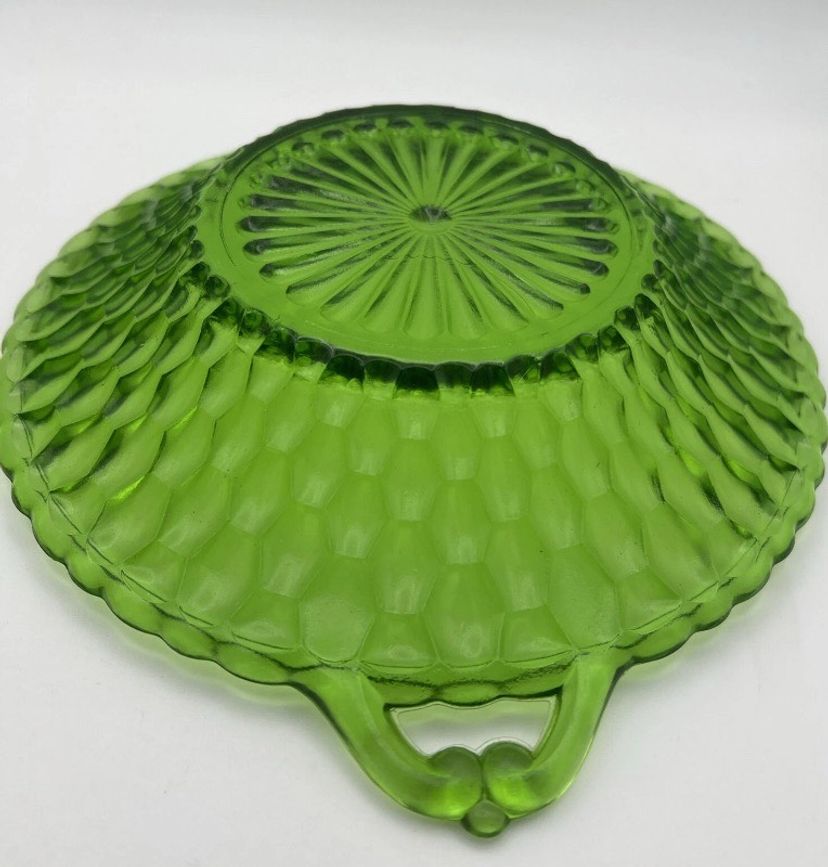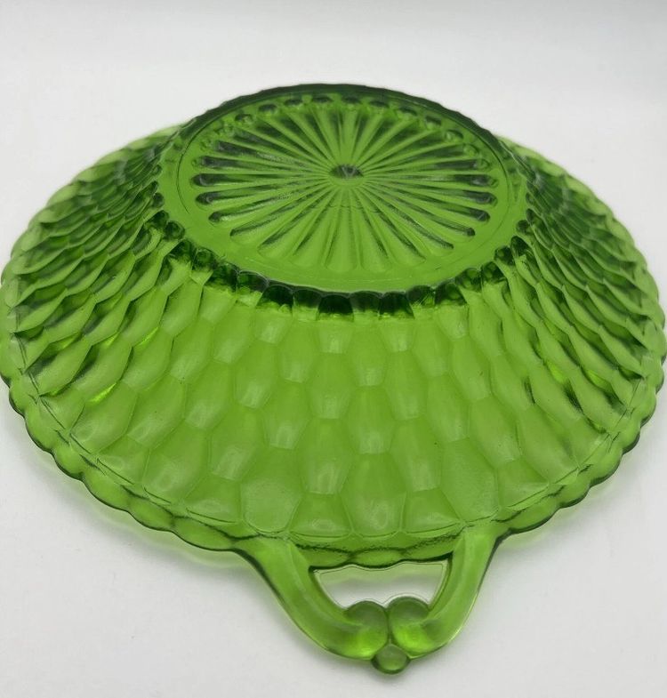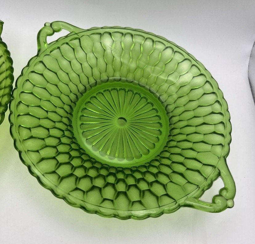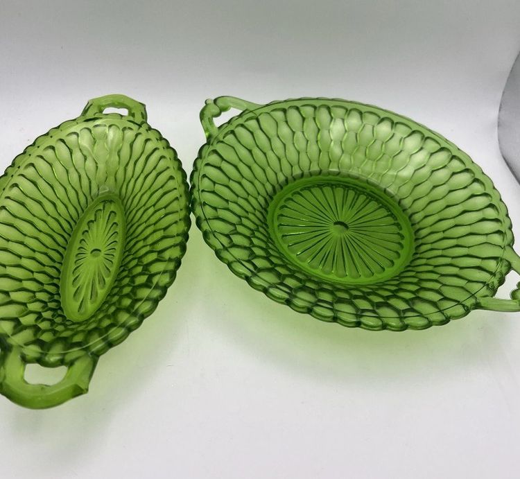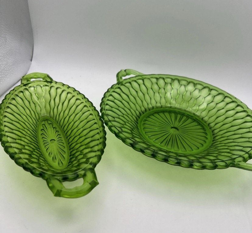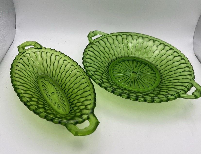 This product is a set of two Indiana Glass 1960s oval handled dish/pickle dish with a honeycomb pattern in green depression glass. These vintage pieces are from the 1960s and feature a mid-century modern style. The dishes have a unique design with two compartments and handles, making them a decorative and functional addition to any vintage collection. The Indiana Glass brand adds authenticity to these original pieces, making them a valuable and collectible item for those who appreciate retro glassware. The round dish is 7.5” diameter edge to edge not including handles. The oval dimensions are 7” length by 4” width. Excellent pre-condition! No chips! Beautiful pieces! Love the color!