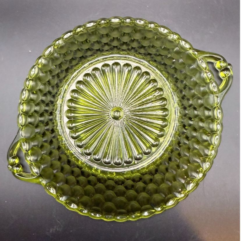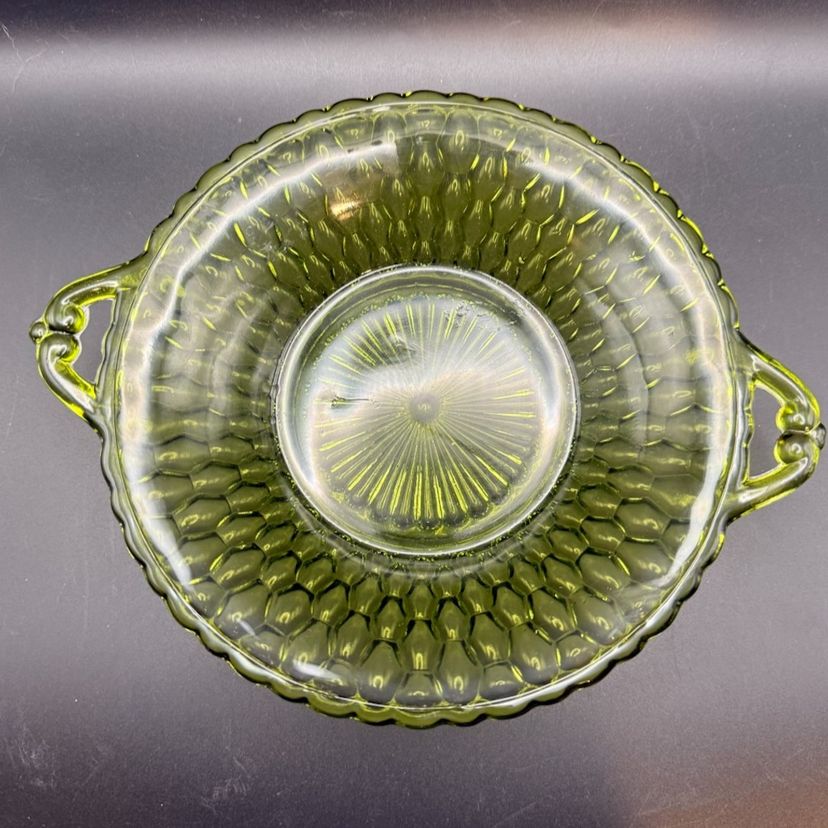 Their "Honeycomb" pattern, characterized by its textured, beehive-like design, was a staple in American households during the mid-20th century. This type of glassware was widely used for serving various dishes, from relishes and candies to desserts and small appetizers. The avocado green color was especially fashionable during the 1950s and 1960s, aligning with the popular mid-century modern aesthetic. These pieces are collected today for their nostalgic appeal and the cheerful splash of color they add to a table setting.