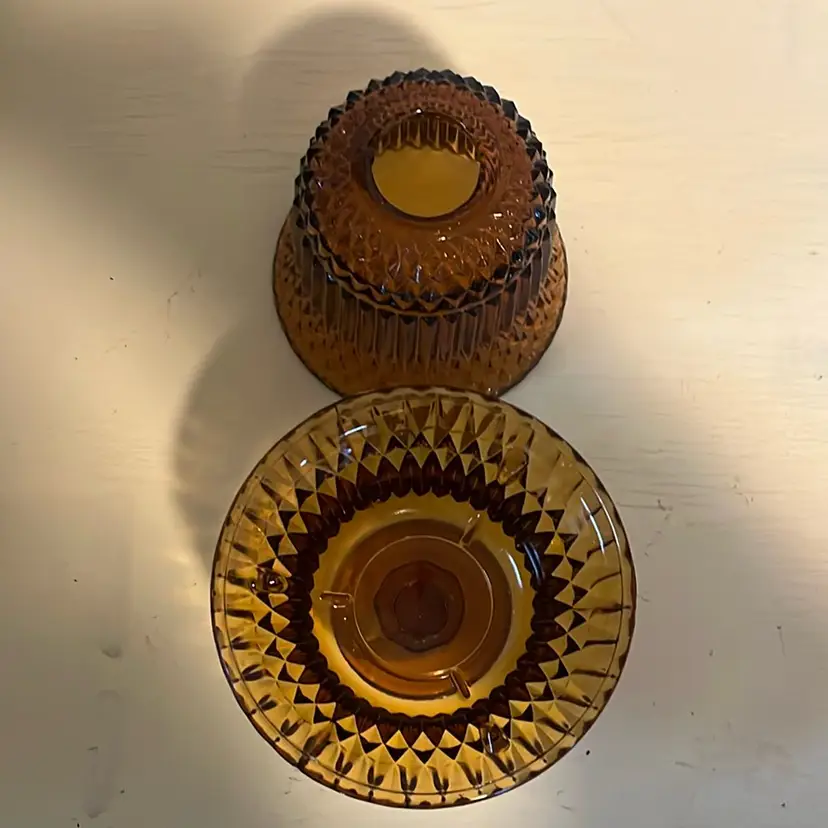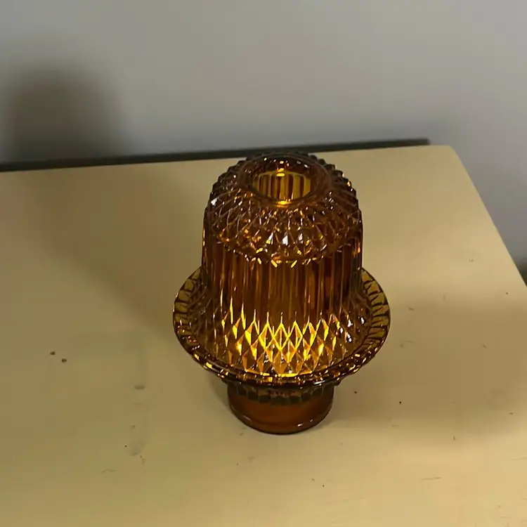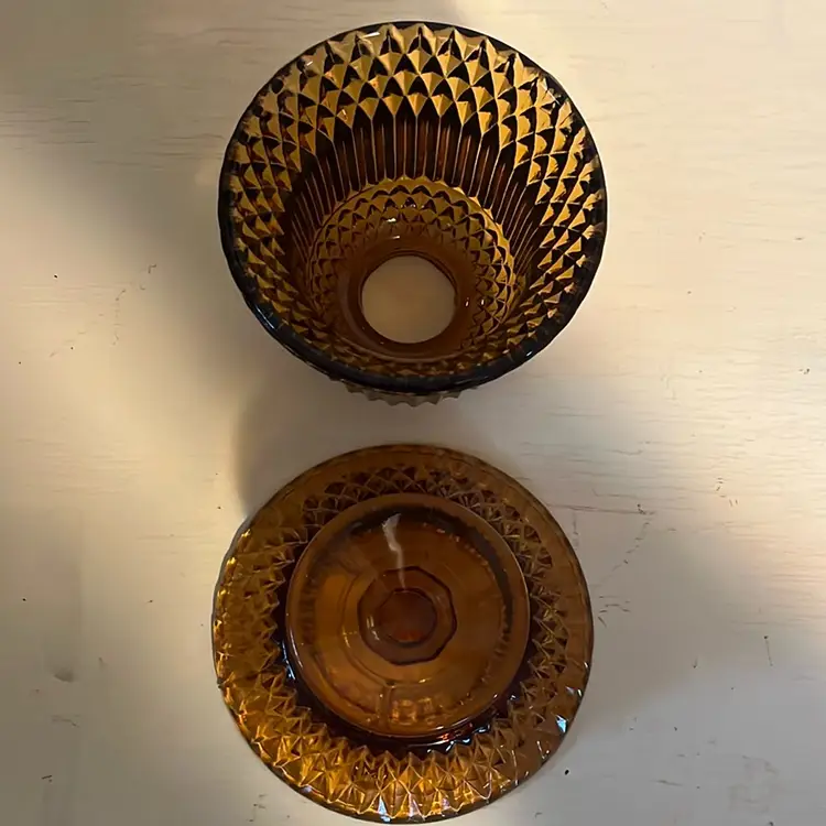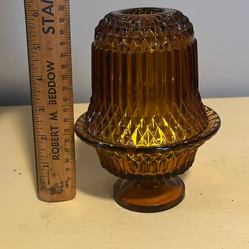 Pressed amber glass, great condition, diamond pattern, @ 6” tall