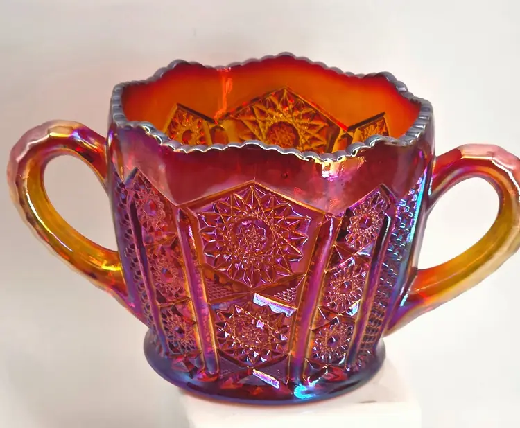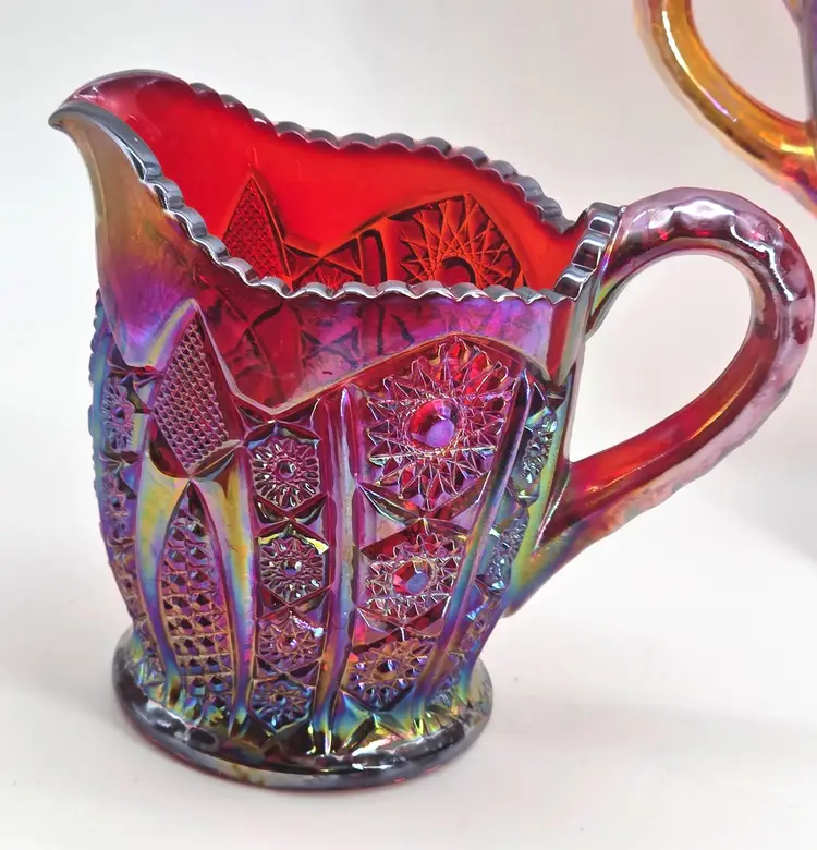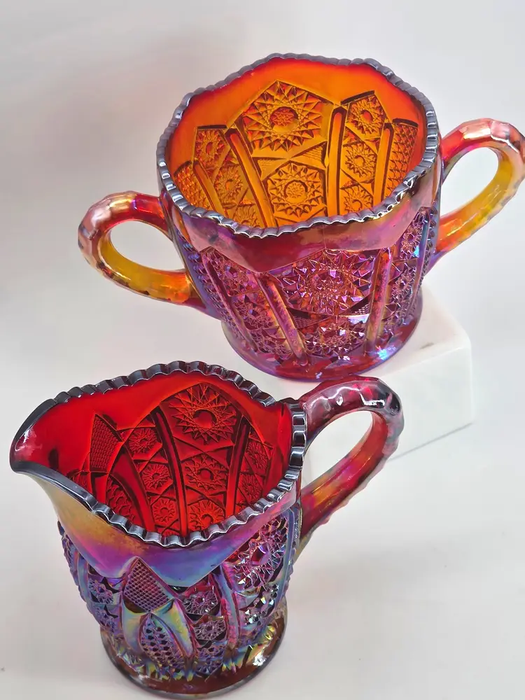 They are in pristine condition with no chips or cracks. The purple iridescence is just beautiful! The pitcher is a dark red base while the sugar is more orange/red.