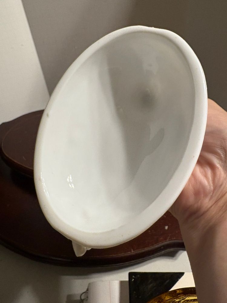 Milk glass, 7” long, 4” tall and 4.5” wide