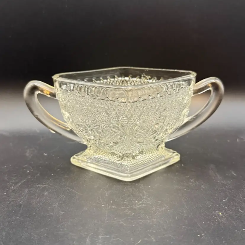 It features the "Sandwich" pattern by Indiana Glass, known for its scrolls and flower molded design. This pattern was produced from 1925 through 1985, and pieces like this are often referred to as "Depression Glass". Features: This specific piece is a sugar bowl with a diamond shape and double handles.