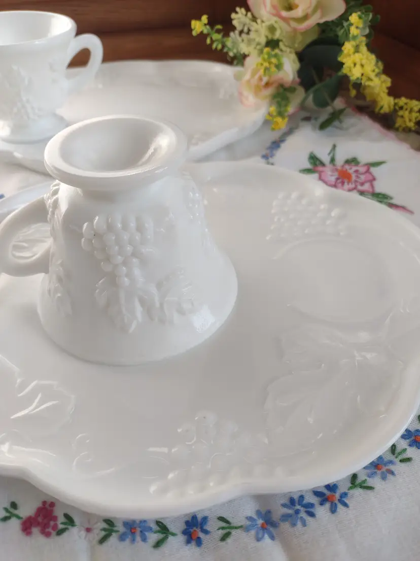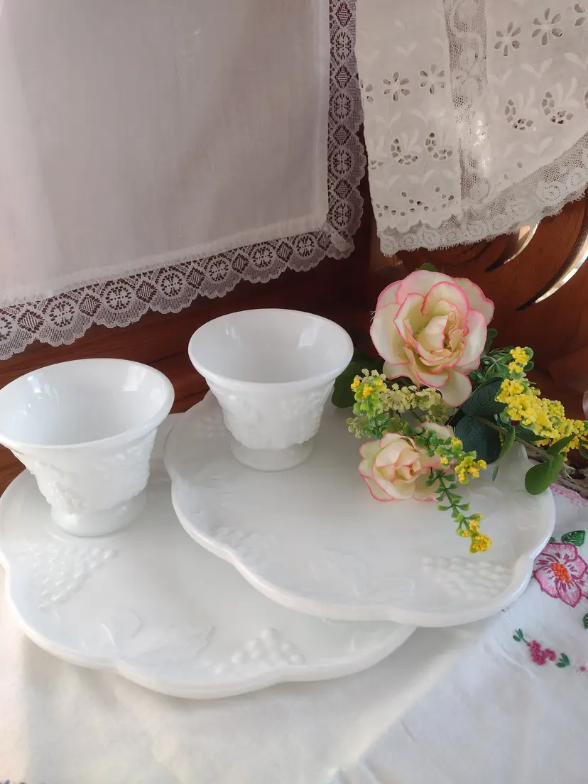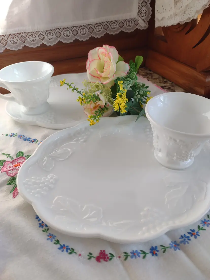 Two plates and two coordinating milk glass cups are included.