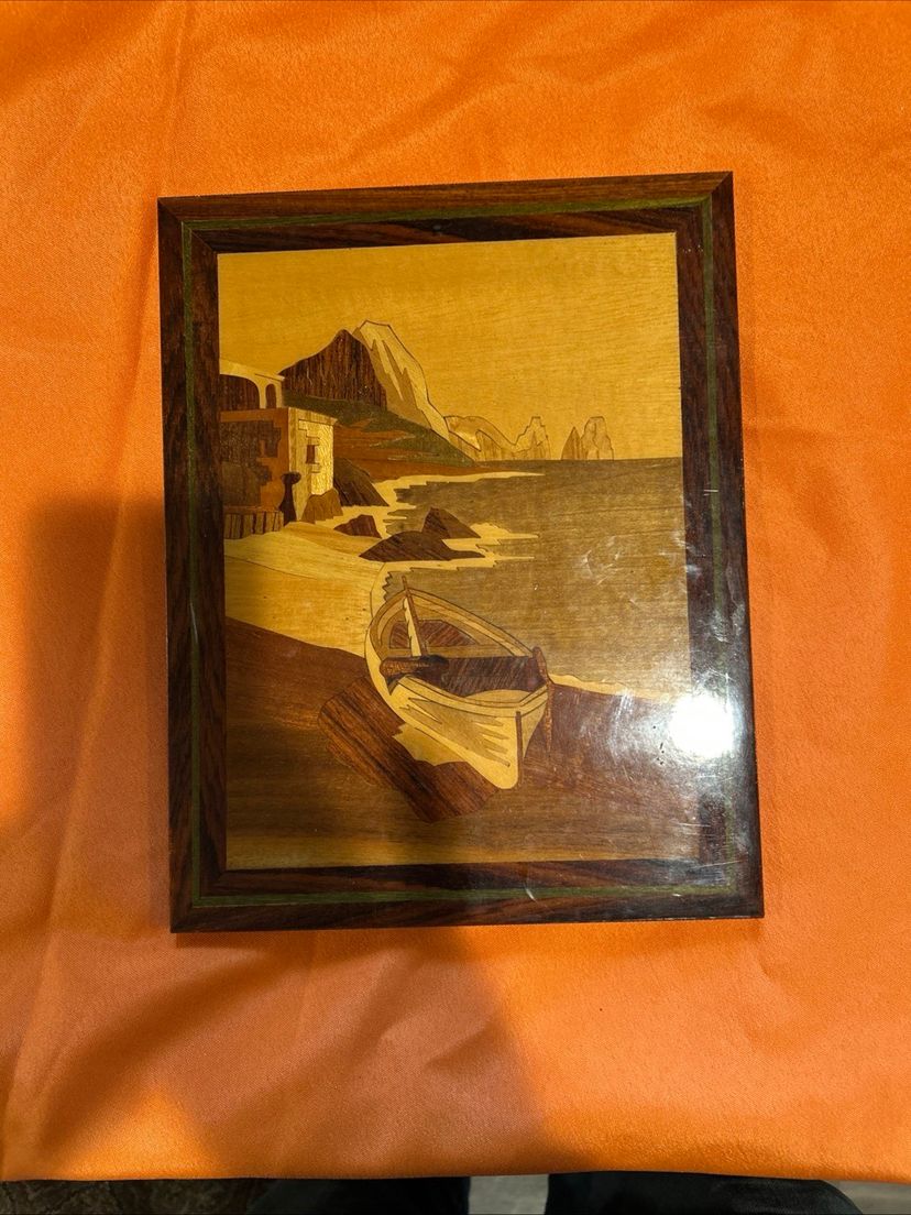 This Vintage Art Wood Inlay Marquetry Boat is a beautifully crafted decorative piece made from wood with intricate marquetry detailing. The boat design adds a touch of elegance and nostalgia to any room, making it a unique and charming collectible item for those who appreciate vintage artistry. The exquisite craftsmanship and timeless beauty of this piece make it a standout decorative item for collectors or anyone looking to add a touch of vintage flair to their home. Any imperfections shown in photos. Used condition.