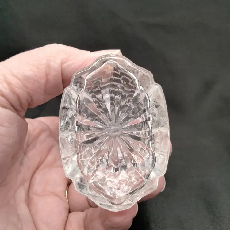 IRICE Japan Pressed Clear Floral Center Pattern and Diamond Point on Sides Glass Perfume Bottle with Stopper Vintage . This is 4.5 inches tall with stopper in place and 2.5 inches long and 1.75 inches wide. This is preowned . No chips cracks or flea bites, Stopper is intact, No residue or scent inside bottle. Excellent condition. Ships USPS