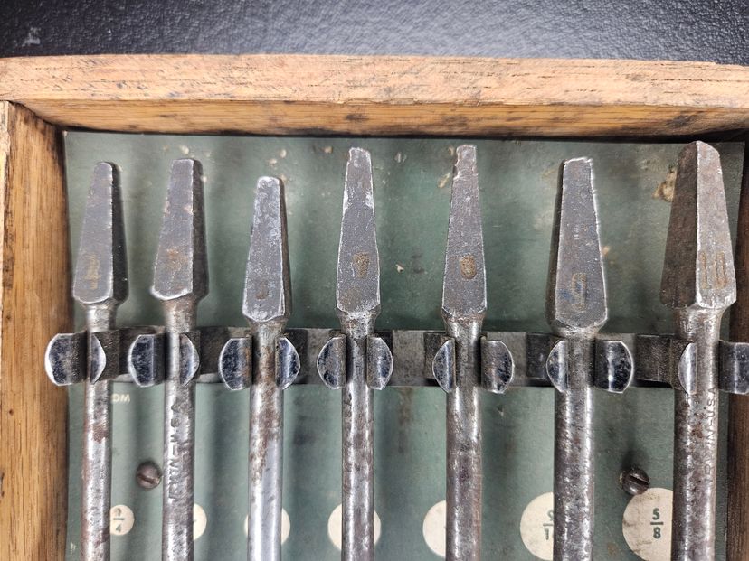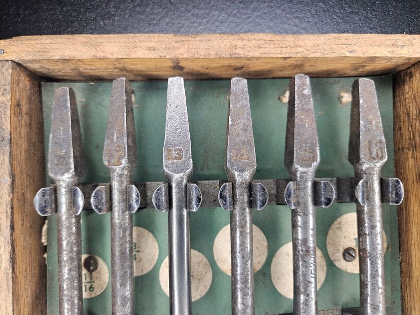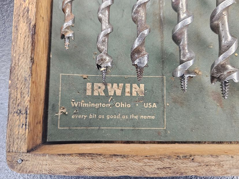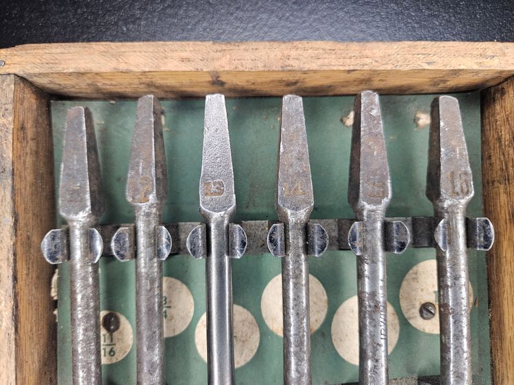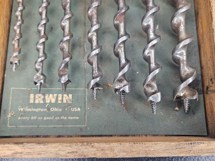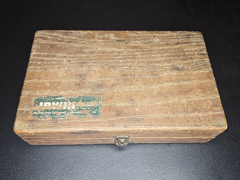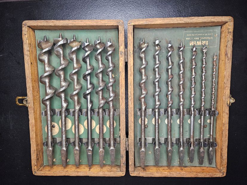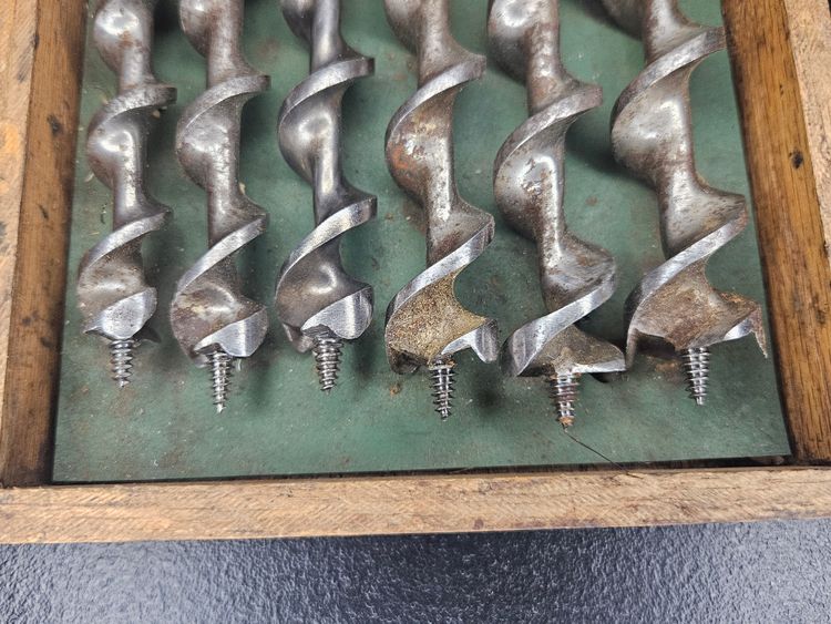 Complete 13 piece set in original wooden box. Sizes 4-16 (1/4"-1") This was my first user set for several years, so some of the bits are sharpened and ready to go. All have good feed screw, spurs and cutting lips.