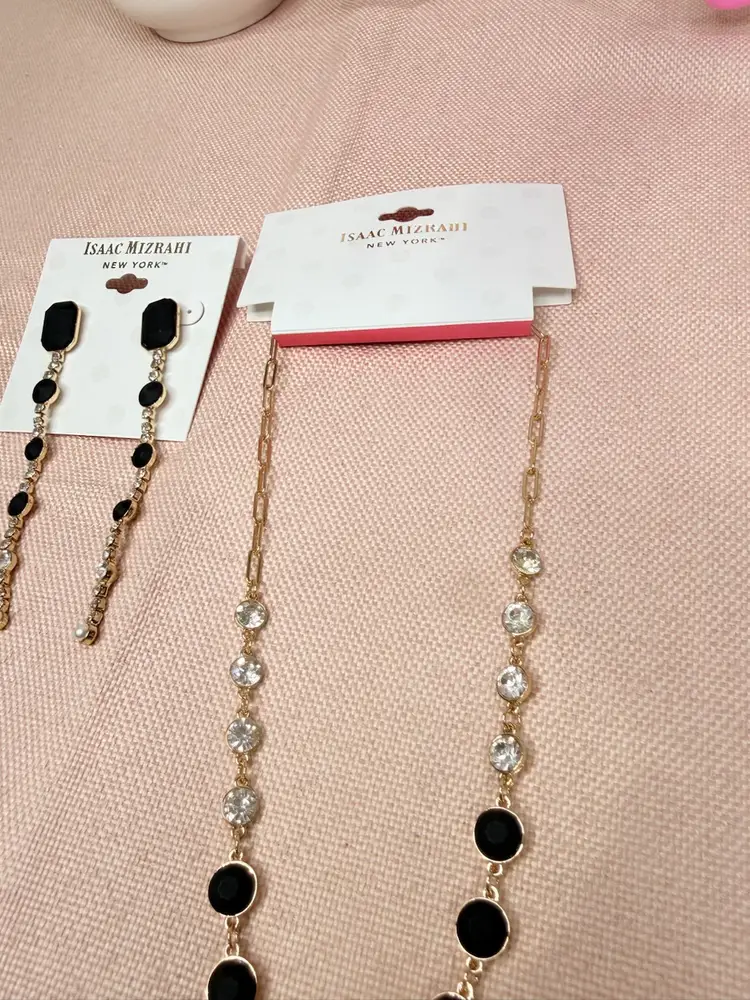 Brand: Isaac Mizrahi Set includes: Necklace Color: Black Main stone color: Black and Clear Type: Jewelry Set Metal: Gold-tone Main stone: Crystal Material: Crystal, Gold-tone Occasion: Formal Theme: Elegant, Luxurious Features: Secure backing Country of origin: China