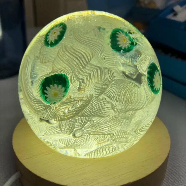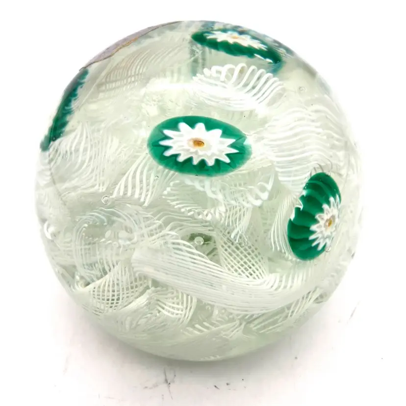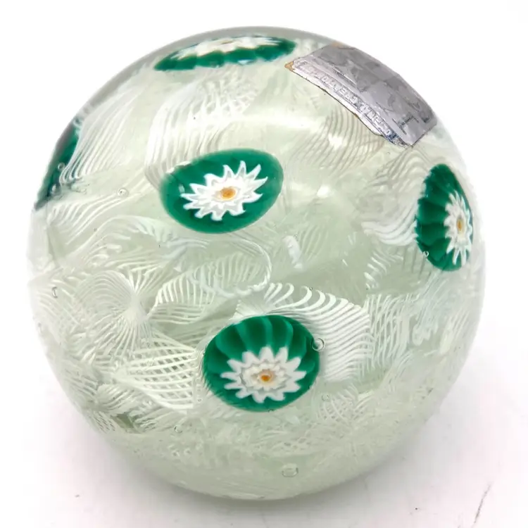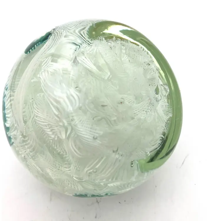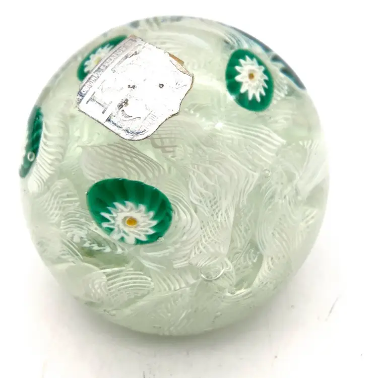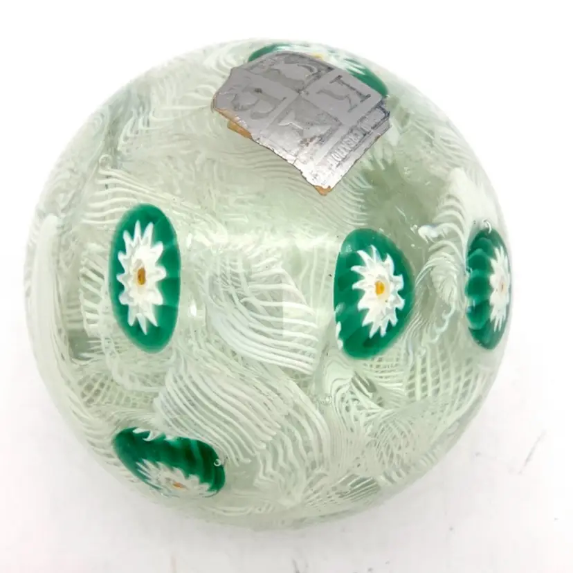 Piece measures 2 7/8” diameter and 2 5/8” tall. Fun green Millifiori murines punctuate the white scramble weight. The excellent condition. *Note - this was confirmed this afternoon as Murano from Facebook Murano group.