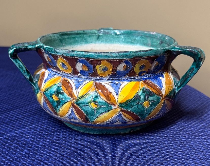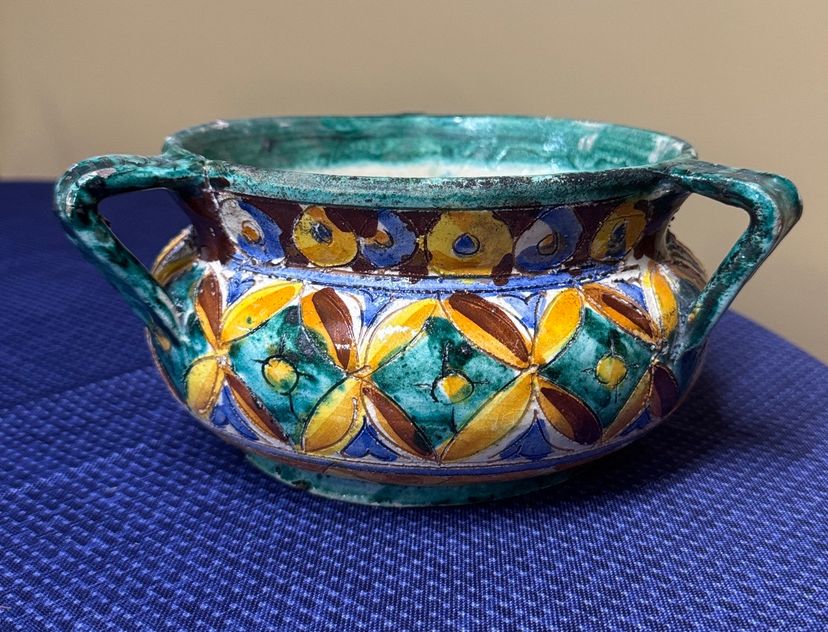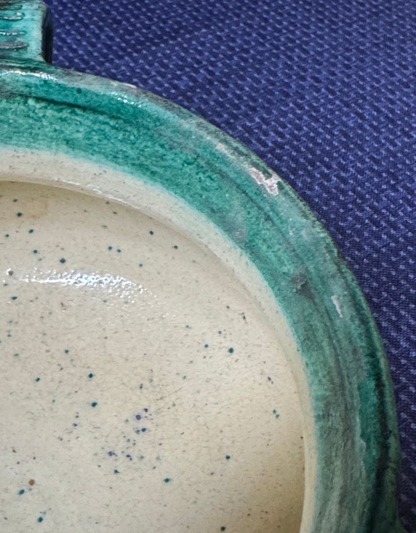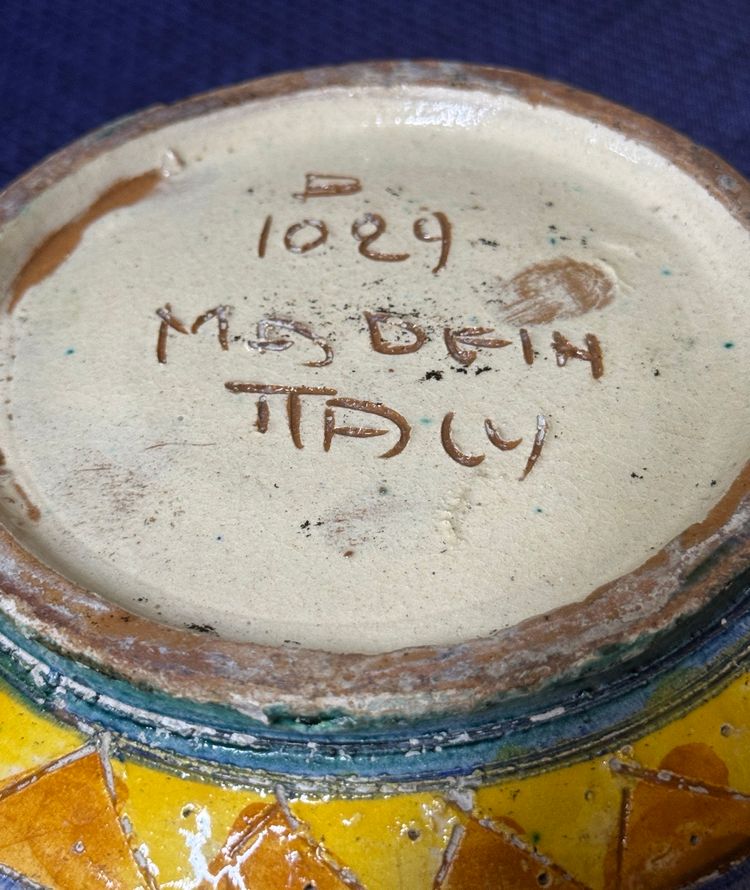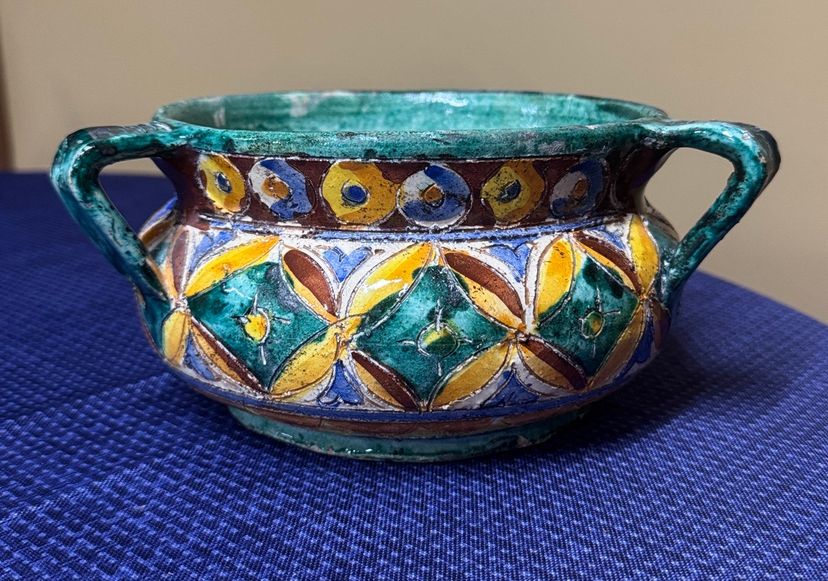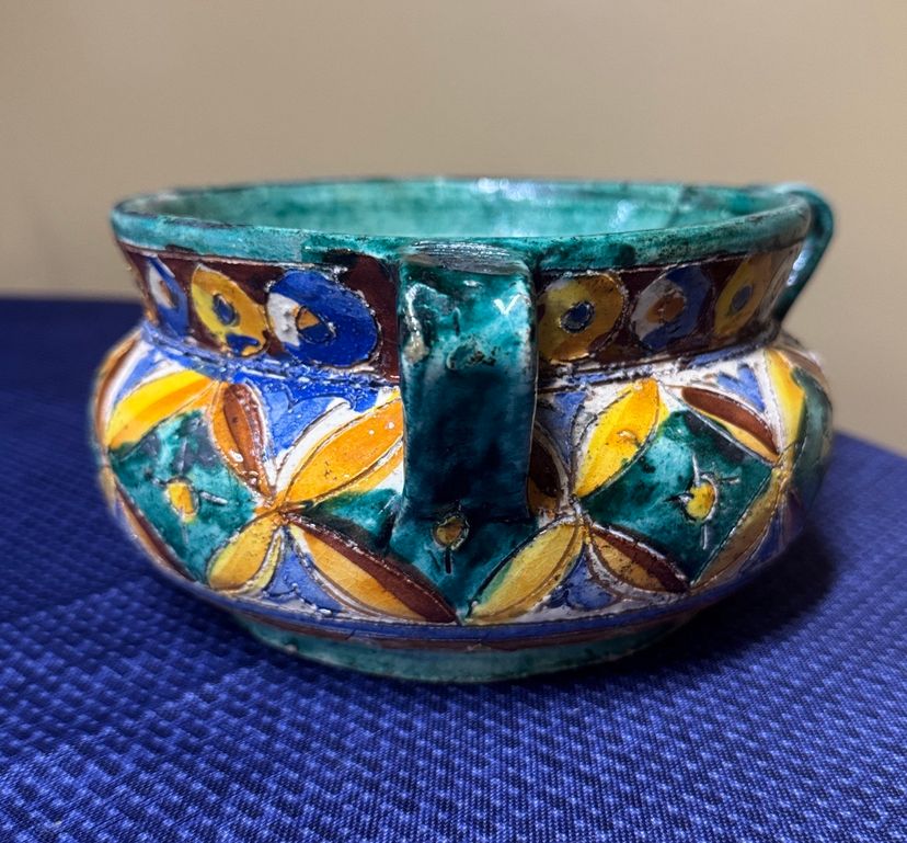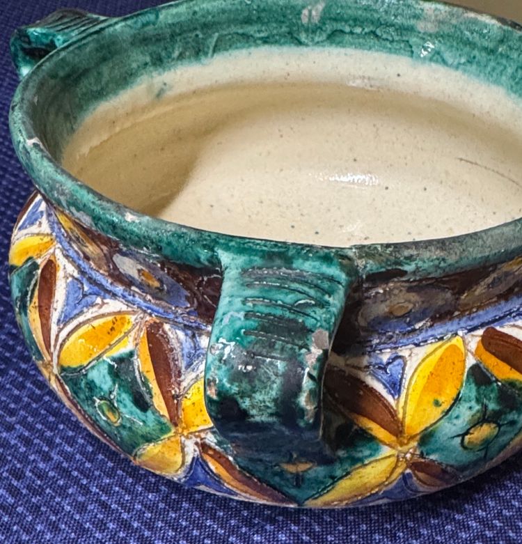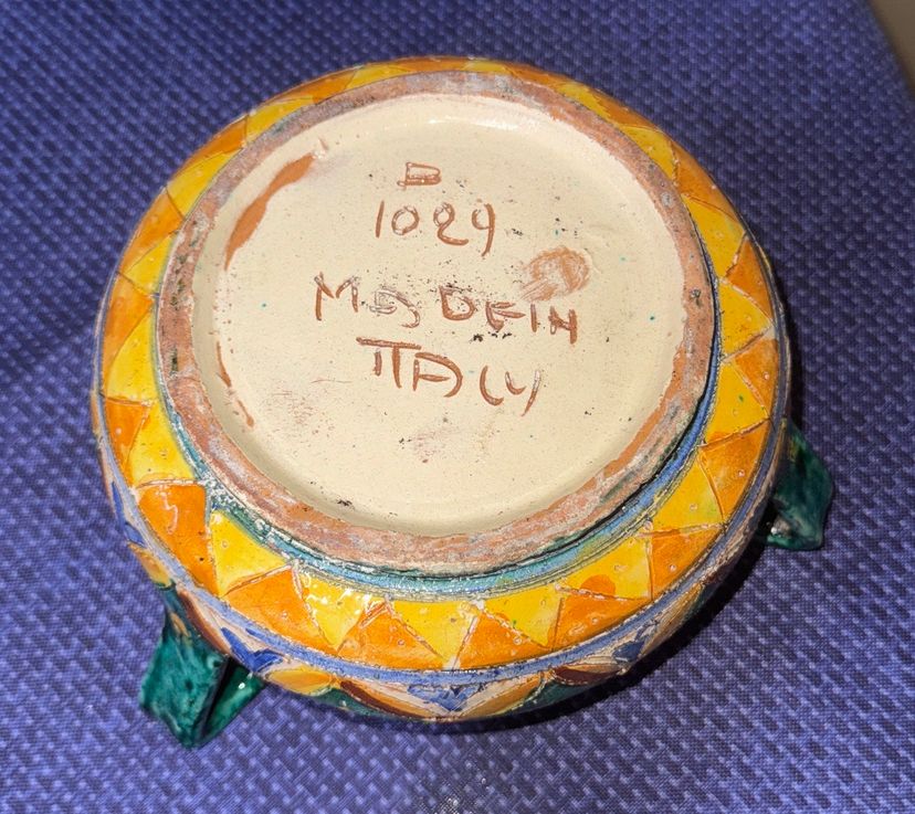 Vintage Italian Sgraffito Majolica Three-handle Planter - Made in Italy Signed 1029 made in Italy 8” diameter 6.5” diameter opening 4” tall This beautifully handcrafted ceramic bowl features vibrant green and yellow colors, perfect for adding a touch of artistry to your home decor. Its unique design and handles make it both functional and decorative. Excellent condition with no actual breaks or chips there is some age wear to the glaze but not a lot. I tried to photograph it. (11471022255)