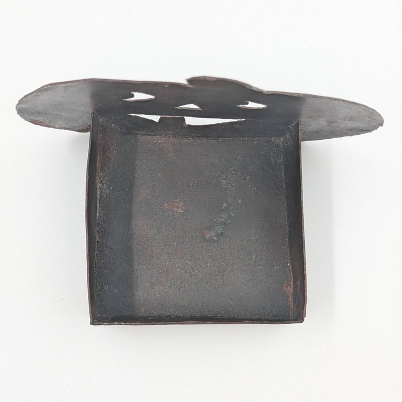 Cute metal votive holder with a jack-o'-lantern metal cutout on the front of a square metal candle holder. Has a couple small rusty spots but they blend in with the patina of the piece.