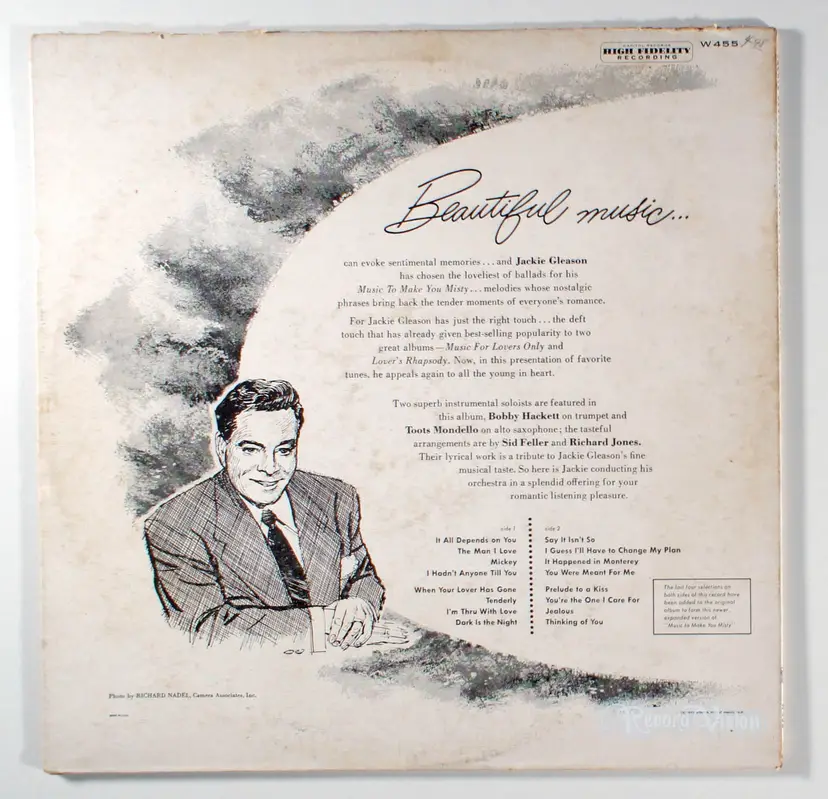 Music to Make You Misty, by Jackie Gleason, was originally issued as a 10-inch extended play record with eight songs. It was reissued several months later as an album with eight additional songs. The musicians featured on the album included Bobby Hackett on trumpet and Toots Mondello on alto sax. Music to Make You Misty reached No. 2 on Billboard magazine's pop album chart in January and February 1954.
