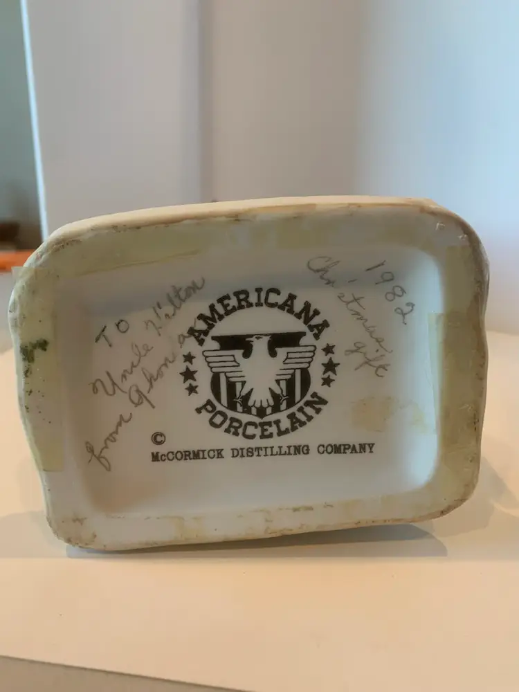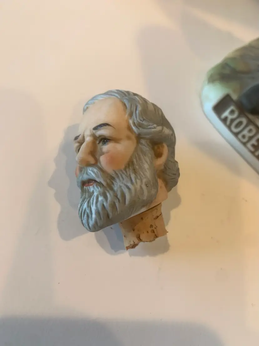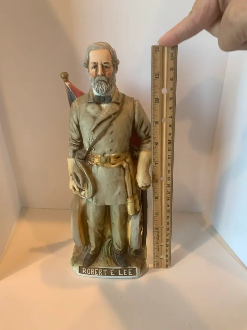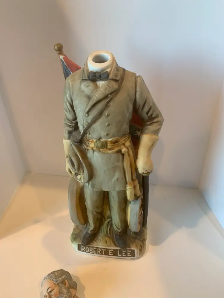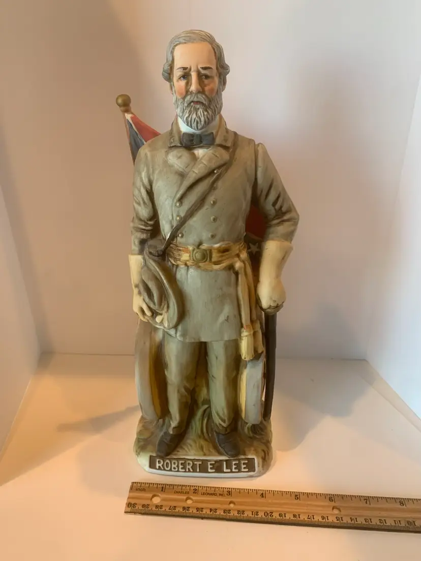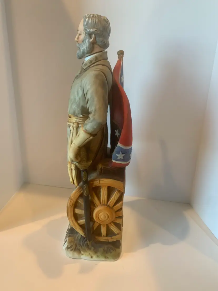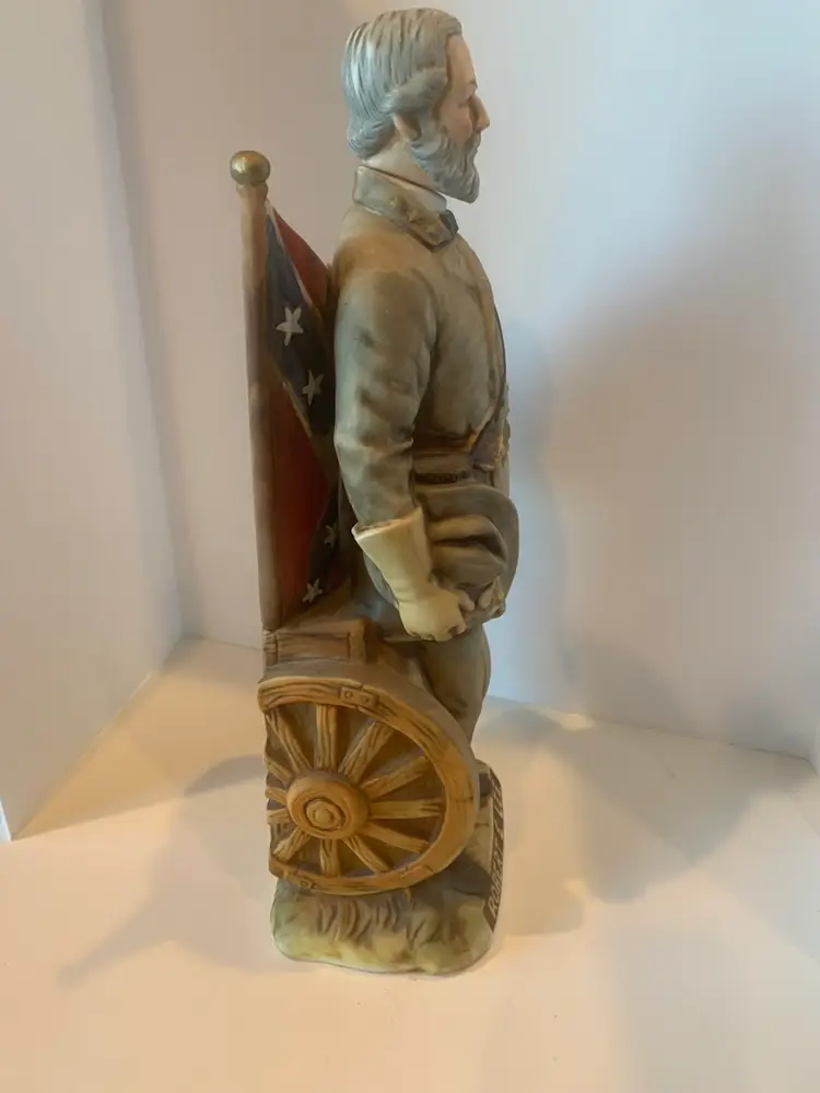 This vintage Robert E. Lee decanter is a ceramic collectible depicting a full-figure likeness of the Confederate general. The decanter has Lee standing upright, dressed in his traditional gray Confederate military uniform.