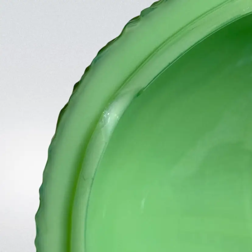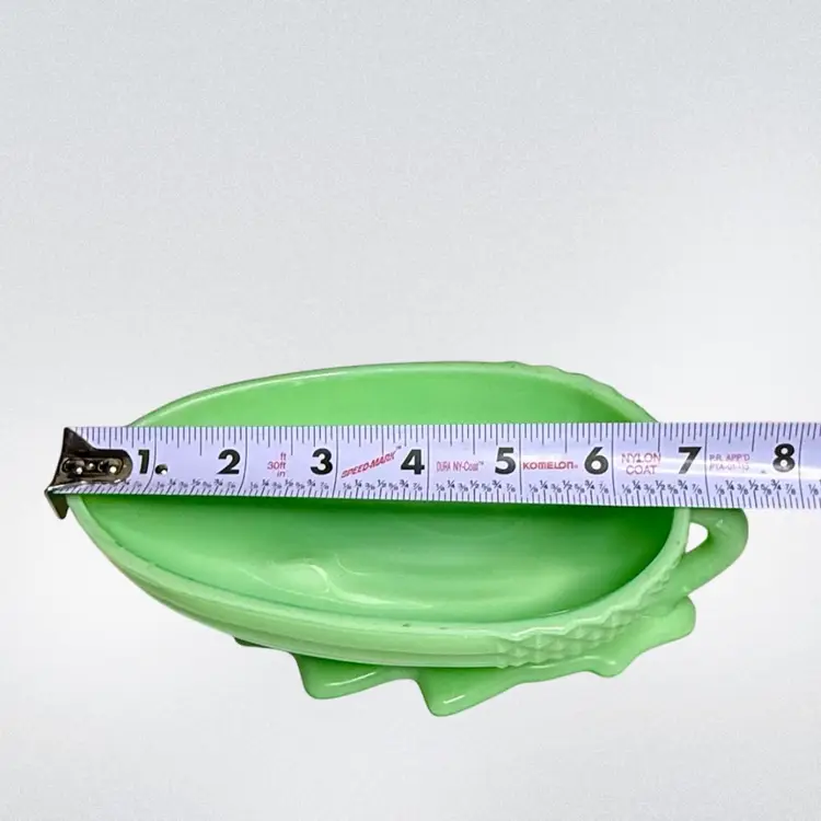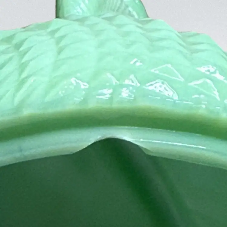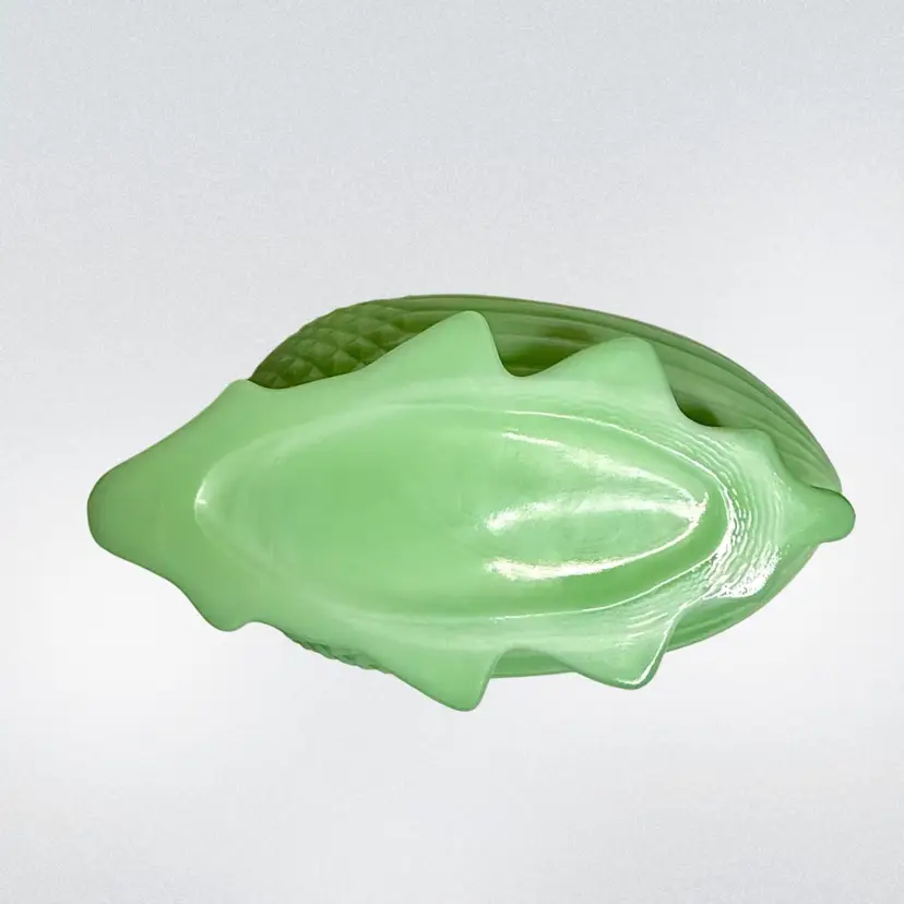 The Martha By Mail Jadeite Squirrel on Acorn Covered Dish is a vintage American-made glass piece featuring a retro squirrel and acorn design. This oval covered dish in jadeite green color is a nostalgic addition to any collection, showcasing the craftsmanship of LE Smith in the 1990s. Add a this unique touch of charm and whimsy to any occasion.