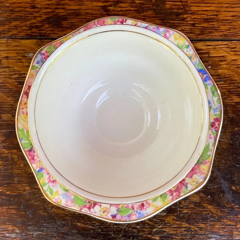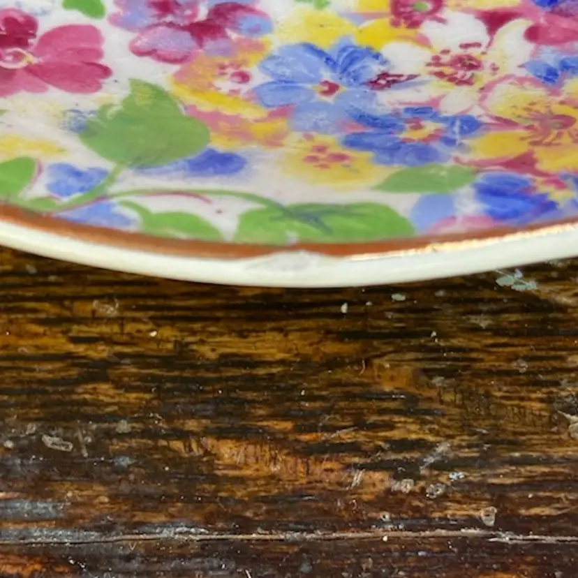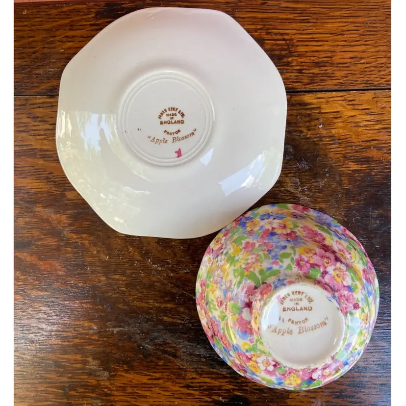 CUP: Approx 4.5”w x 2”h and 8 ounces. SAUCER: 6.25”w x .75”h. Preowned condition. Cup has no chips or cracks. Saucer has crazing on bottom and one small chip on edge (last image). Gold gilt is in good condition for age. See images as part of description.