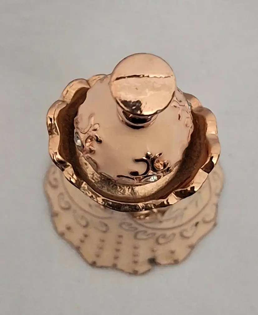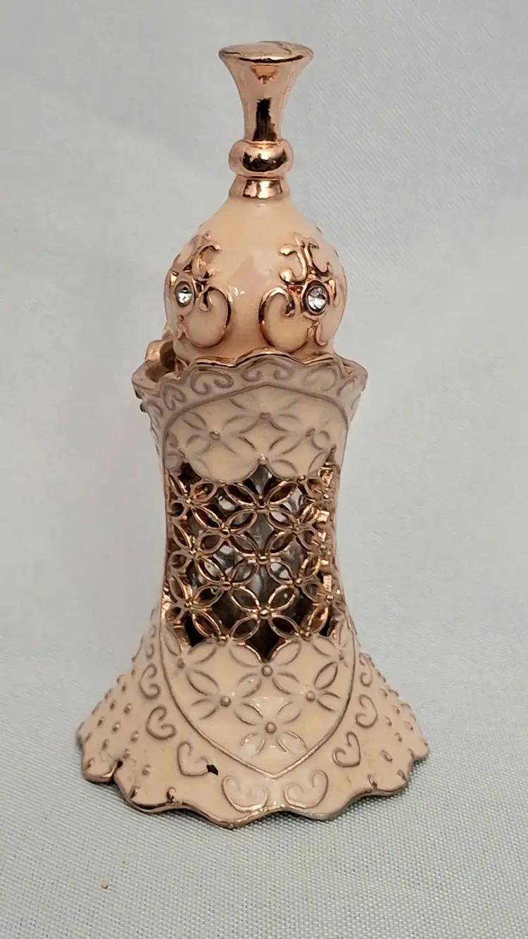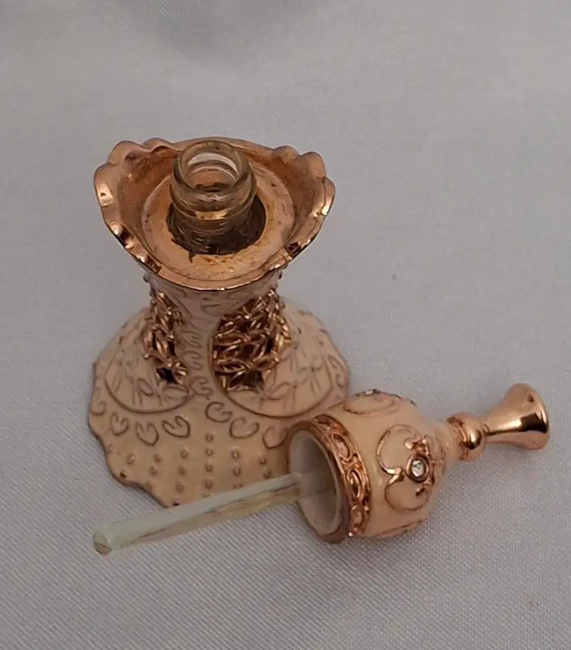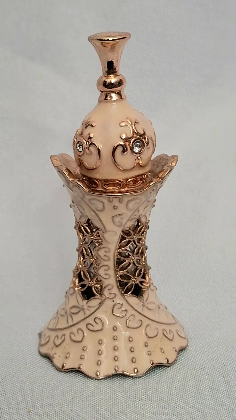 🌹 Japara Rose Gold Perfume Bottle with Glass Dauber Bring timeless elegance to your vanity with this Japara rose-colored brass perfume bottle, standing 2⅞ inches tall. Beautifully enameled in a soft rose gold tone, it features delicate detailing, a screw-off top with a glass dauber, and velvet on the bottom to protect your surfaces. Its classic shape and romantic finish make it perfect for a vintage dressing table surrounded by pearls and roses. ✨ Details: • Height: 2⅞ inches • Material: Rose-colored brass with enamel finish • Screw-off top with glass dauber • Velvet base • Excellent vintage condition A bright and airy treasure — elegant, feminine, and perfect for display or gifting.