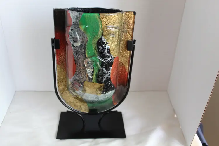 The Jasmine Decorative Fused Glass V-Vase Shape With Stand is a unique and eye-catching piece of art glass. Created with a production technique of fused glass, this multicolor vase features an abstract pattern that adds a touch of artistic flair to any space. The vase stands with its accompanying stand, making it a versatile and stylish addition to any decor. Perfect for displaying flowers or simply as a statement piece, this original piece of art glass from Jasmine is sure to be a conversation starter in any room.