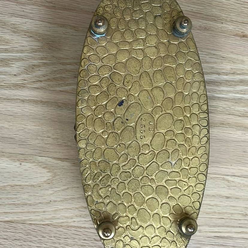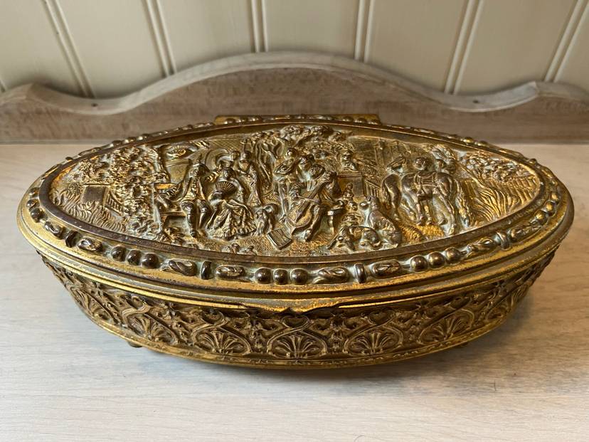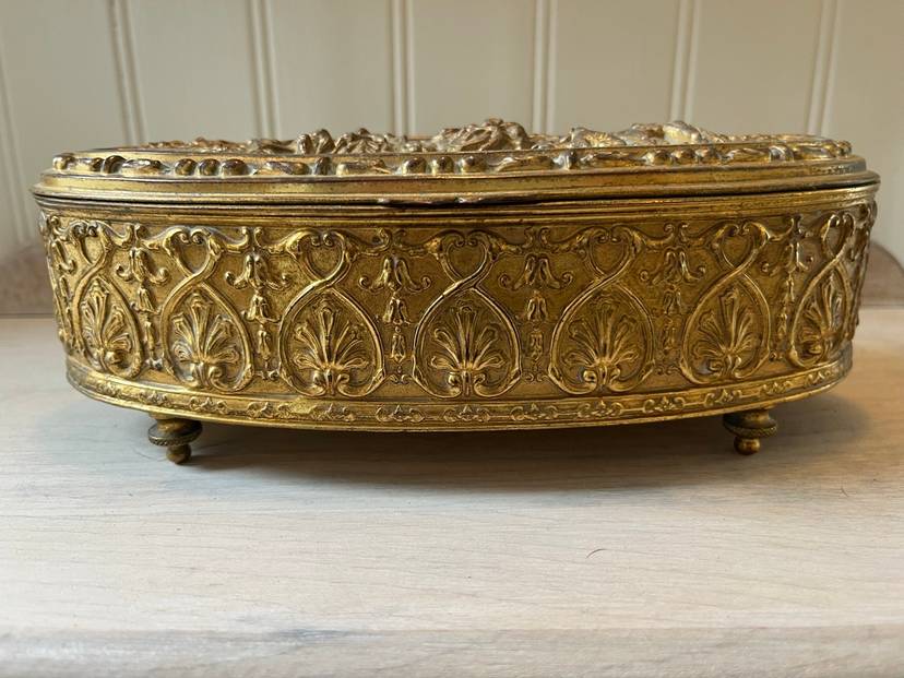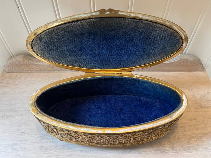 Brass antique Jennings Brothers jewelry box marked JB 2555 on the base with blue velvet lining.