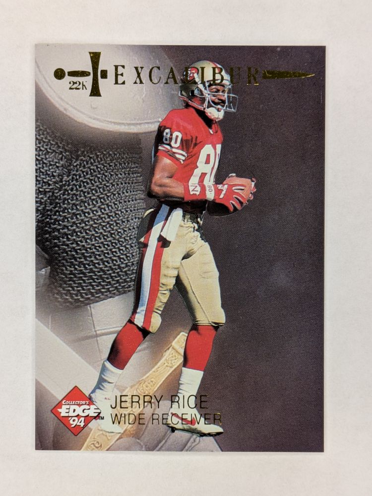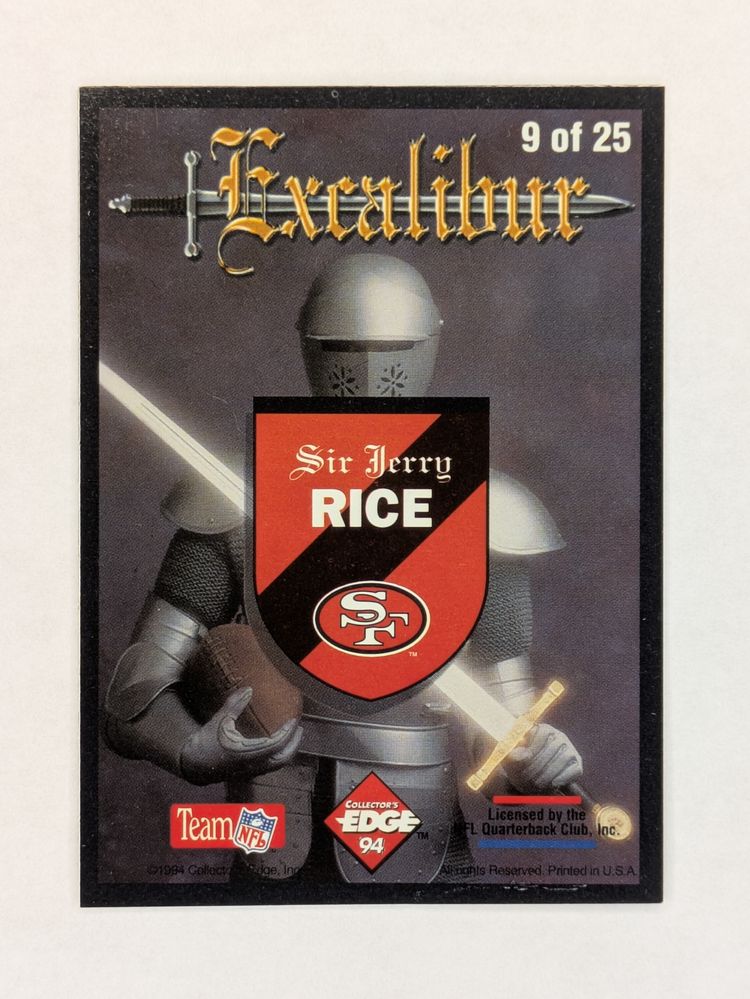 1994 Collector’s Edge Excalibur #9 of 25 Jerry Rice card featuring the Hall of Fame wide receiver dubbed “Sir Jerry” in this medieval-themed insert set. Out of Mississippi Valley State, Rice developed his legendary hands by catching bricks tossed to him by his father, a bricklayer.