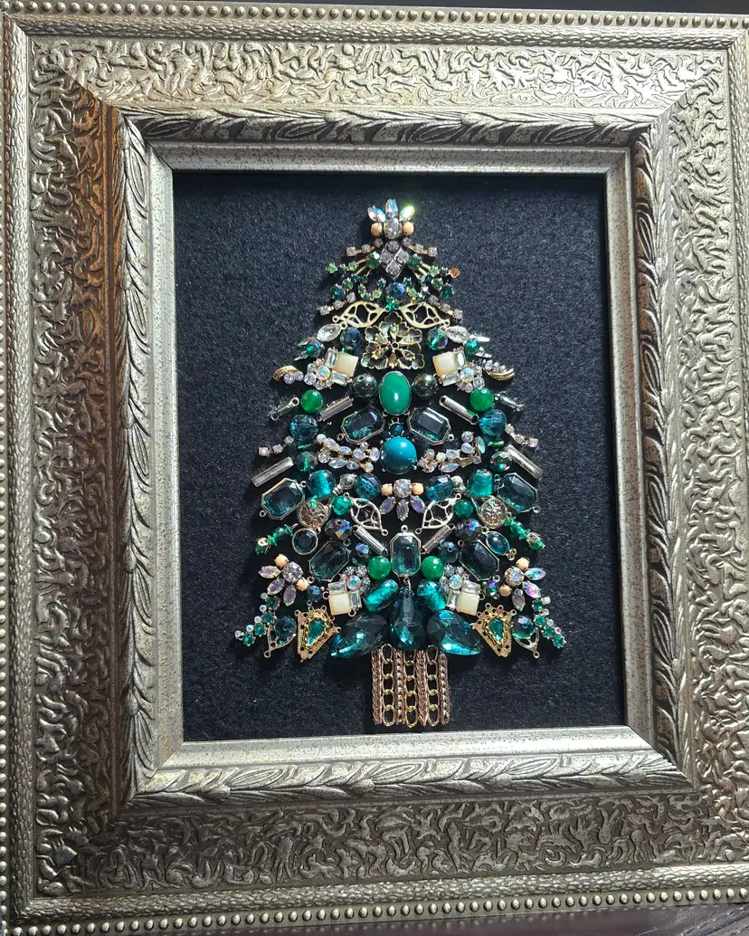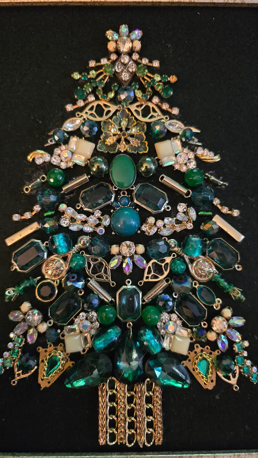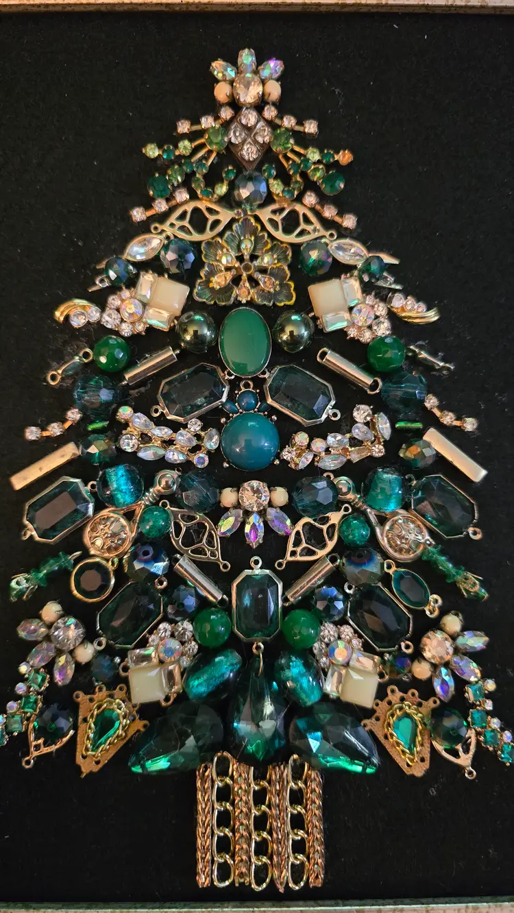 This stunning handmade Christmas tree artwork is created using a rich mix of emerald green gems, sparkling crystals, vintage jewelry pieces, pearls, and shimmering gold accents. Each jewel and charm is thoughtfully arranged to form a beautifully detailed Christmas tree that catches the light from every angle.