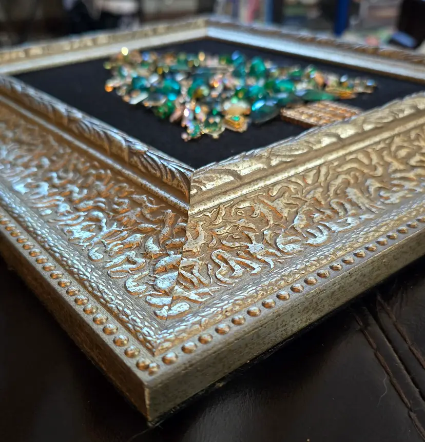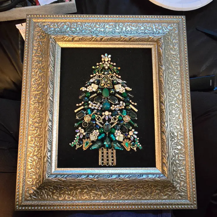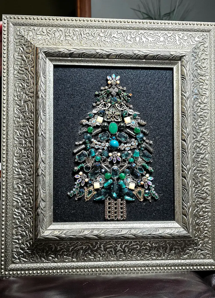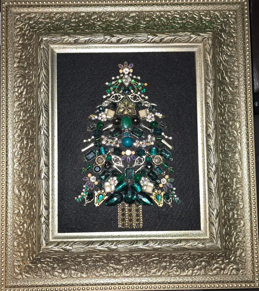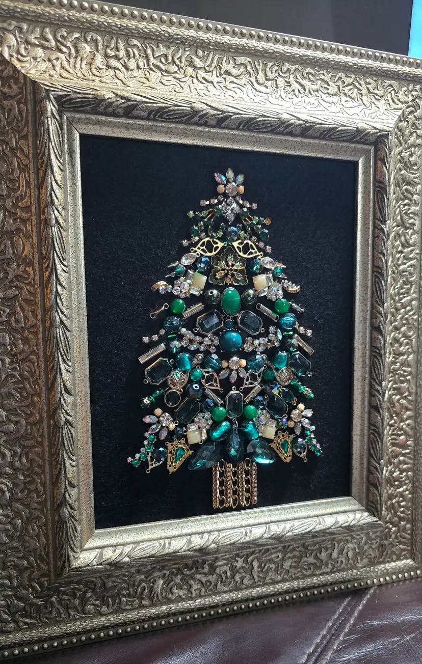 This stunning handmade Christmas tree artwork is created using a rich mix of emerald green gems, sparkling crystals, vintage jewelry pieces, pearls, and shimmering gold accents. Each jewel and charm is thoughtfully arranged to form a beautifully detailed Christmas tree that catches the light from every angle.