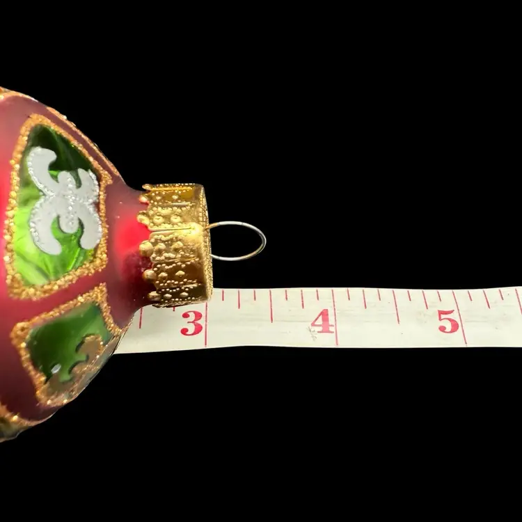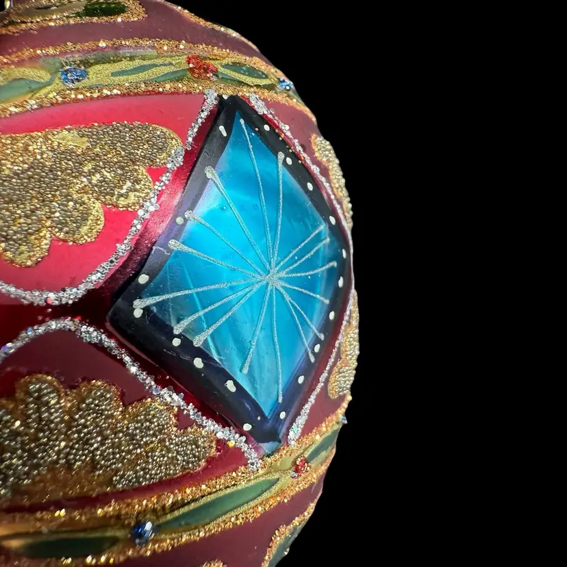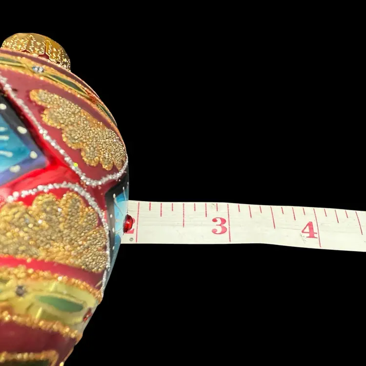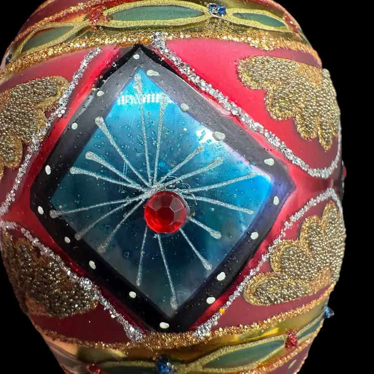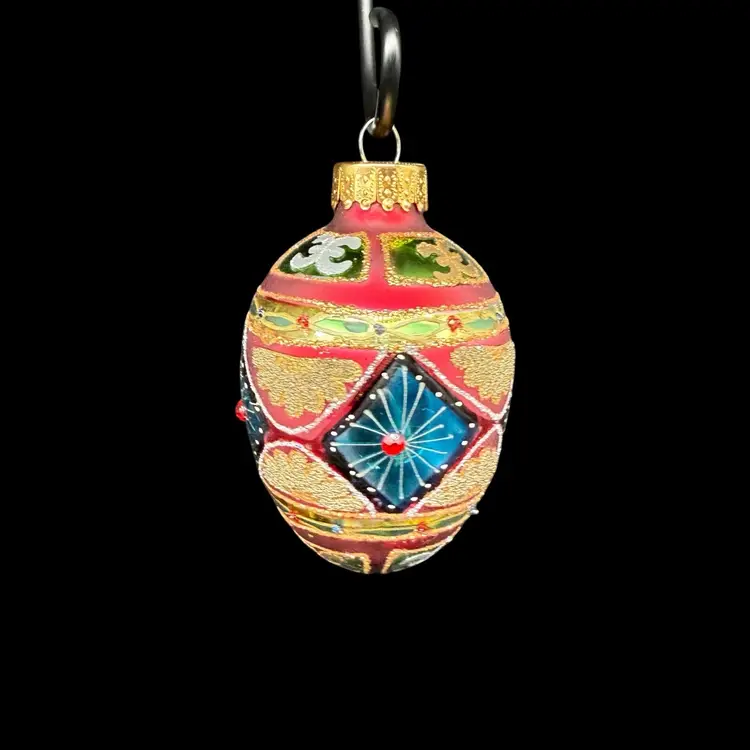 The Jeweled Egg Shaped Christmas Ornament by Unique Treasures is an oval-shaped ornament made of glass. This multicolored ornament features a decorative design in the shape of an egg, perfect for celebrating the holiday season. Add a special touch to your decor with this unique and collectible ornament.