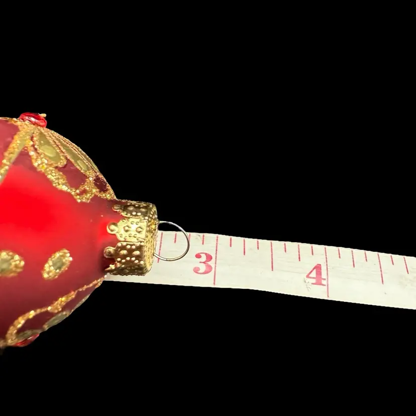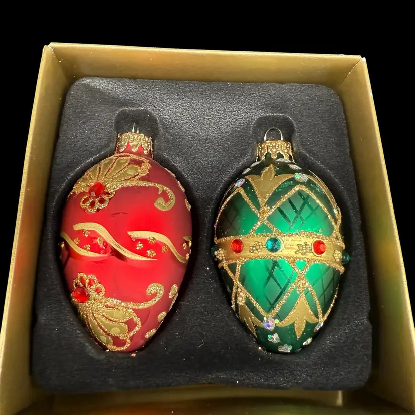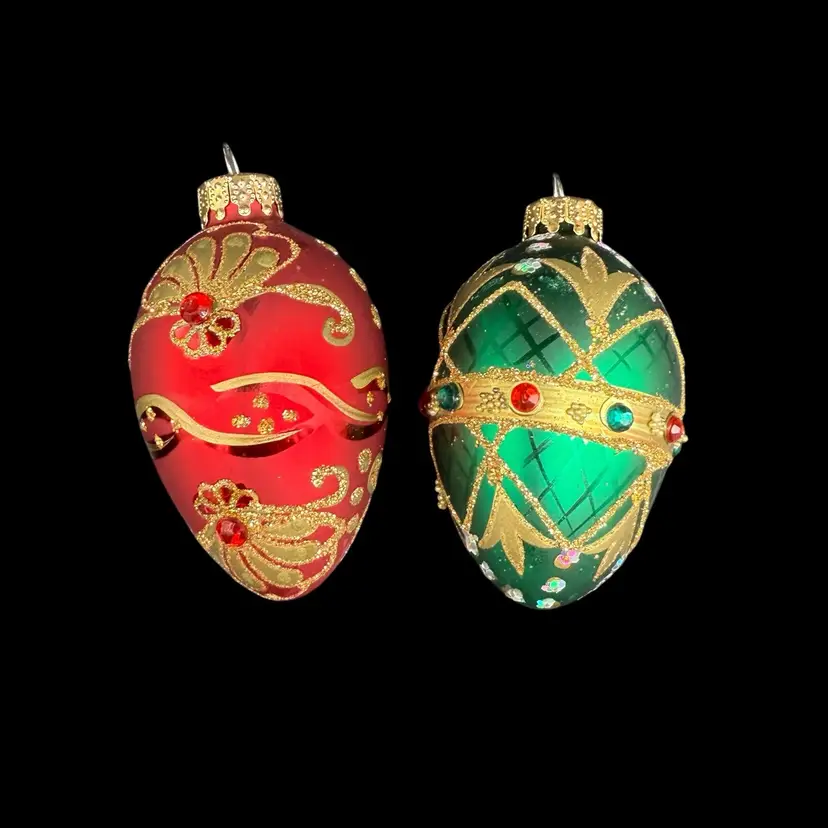 The Jeweled Egg Shaped Christmas Ornaments by Unique Treasures are a set of two small, oval-shaped ornaments made of glass. These multicolored ornaments feature a decorative design in the shape of an egg, perfect for celebrating the holiday season. Add a special touch to your decor with these unique and collectible ornaments.