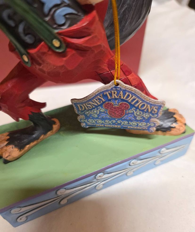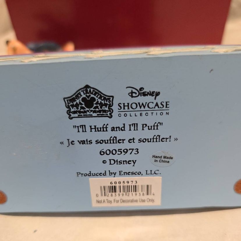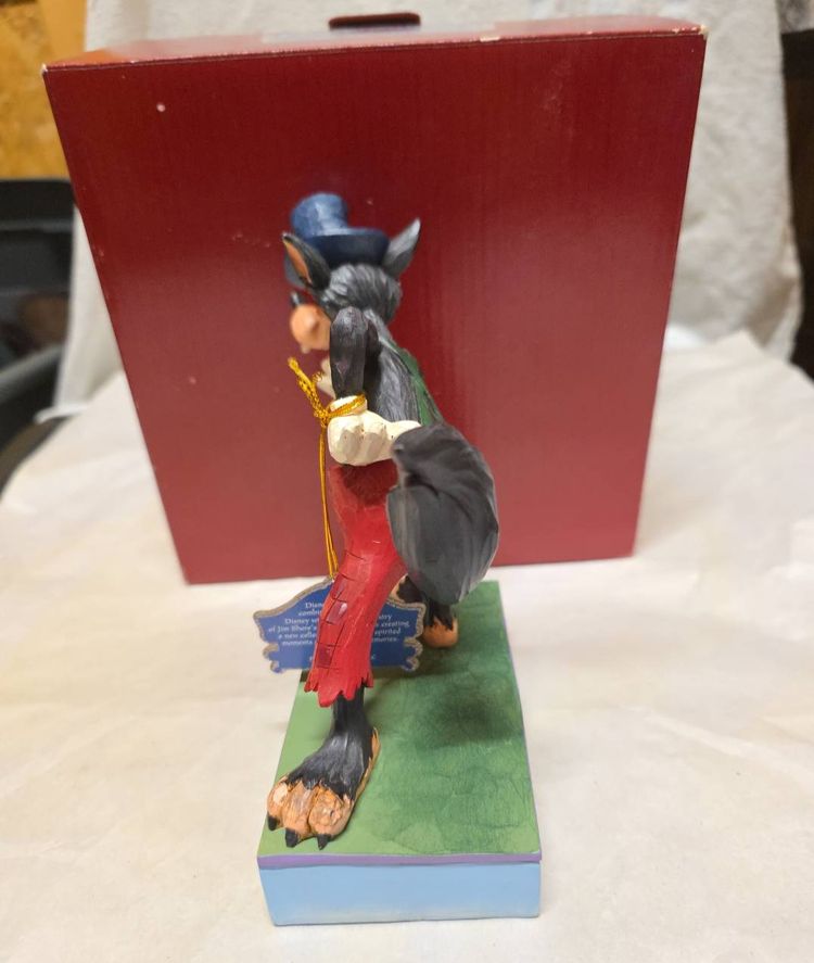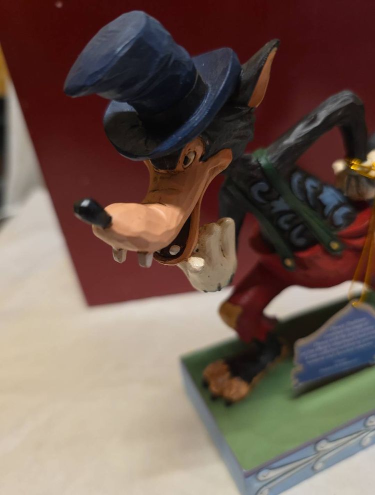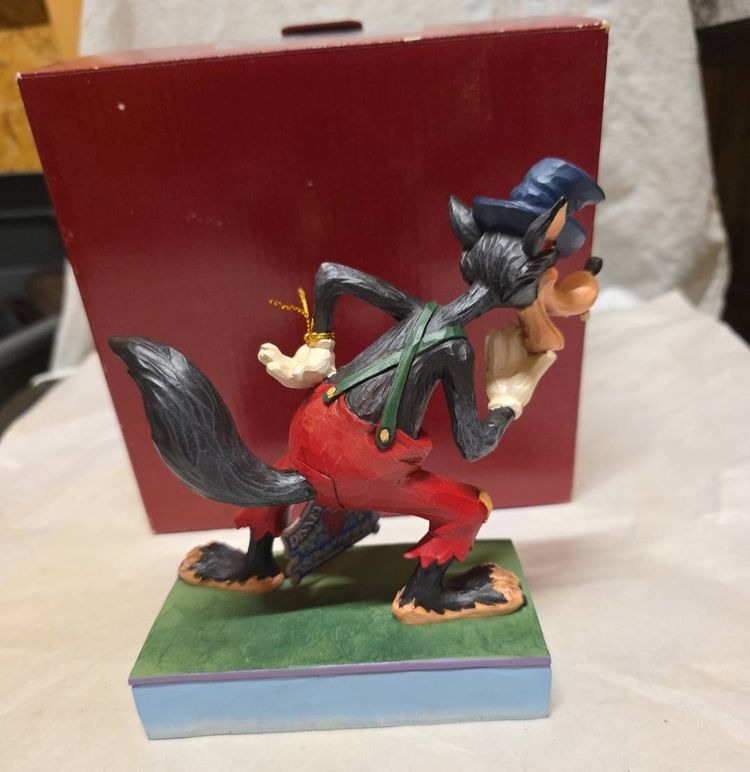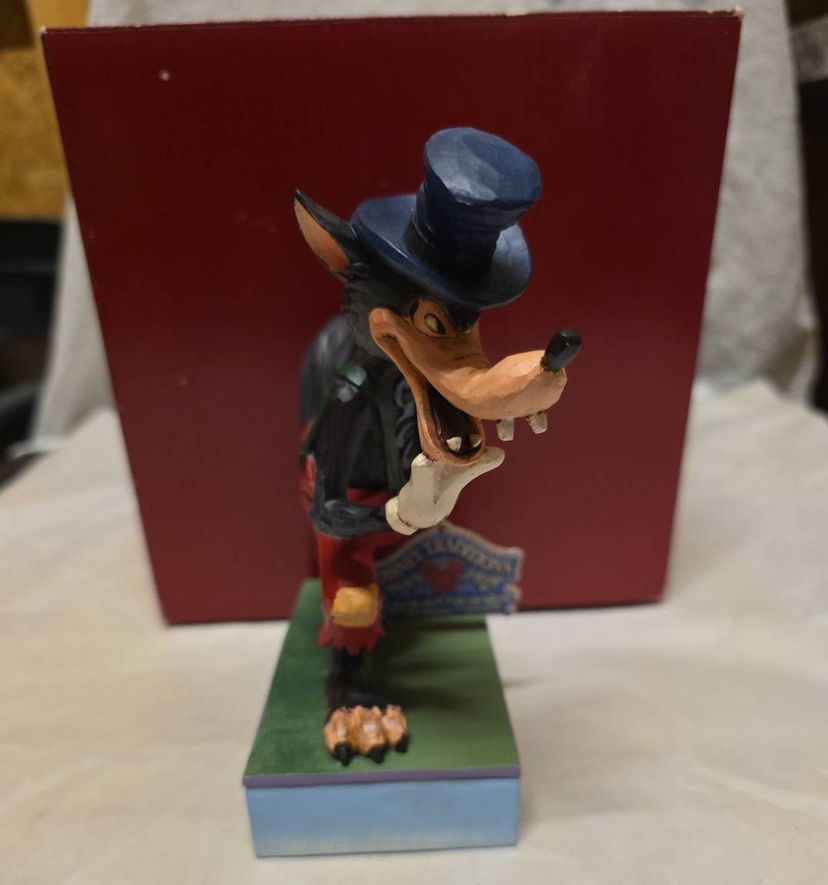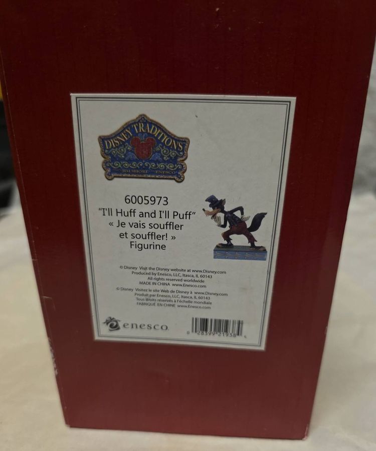 The product is a medium-sized figurine titled "Jim Shore Disney Traditions I'll Huff and I'll Puff 6005973 Big Bad Wolf" by artist Jim Shore. This traditional style figurine features a 3D effect, is a limited edition, retired piece, and comes boxed. The hand-painted resin figurine depicts the Big Bad Wolf character from the Disney collection, making it a charming addition to any room for all occasions. Measuring 6.25 inches in height and 5 inches in width, this multicolored figurine captures the essence of classic Disney storytelling in a beautifully crafted design.