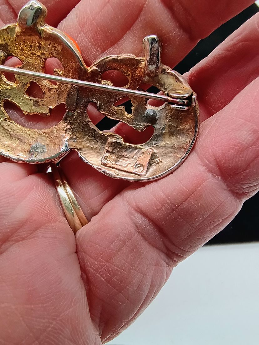 Vintage JJ Jonette Jewelry Company Gold Tone with Enamel Pair of Jack O'Lanterns Pumpkins Pin Brooch. Pin. This is 2 inches long and about 1 inch tall. Great Seasonal piece on your lapel or scarf or jacket. No Chipping or cracking on enamel, Pin Back secure, no warping or deformity. This is in Excellent condition. Ships USPS domestically