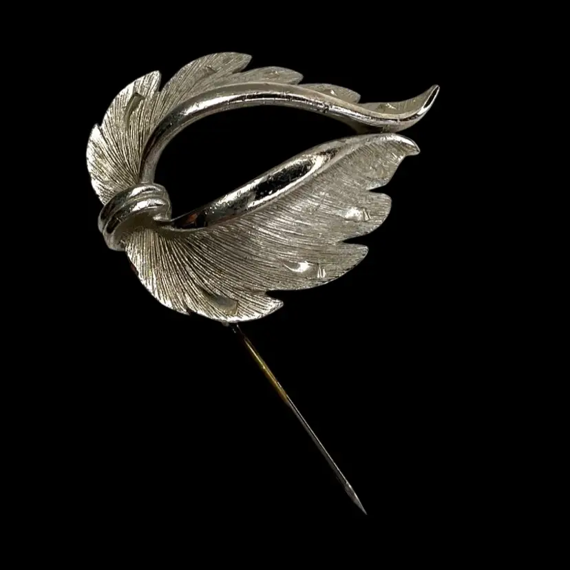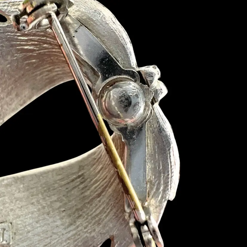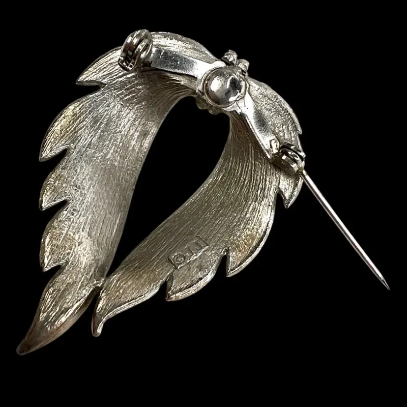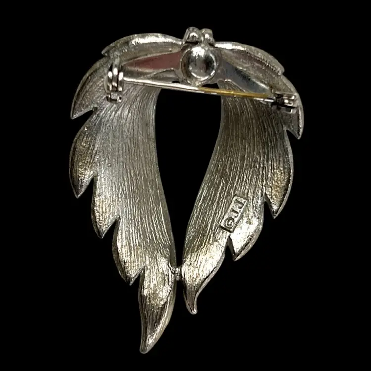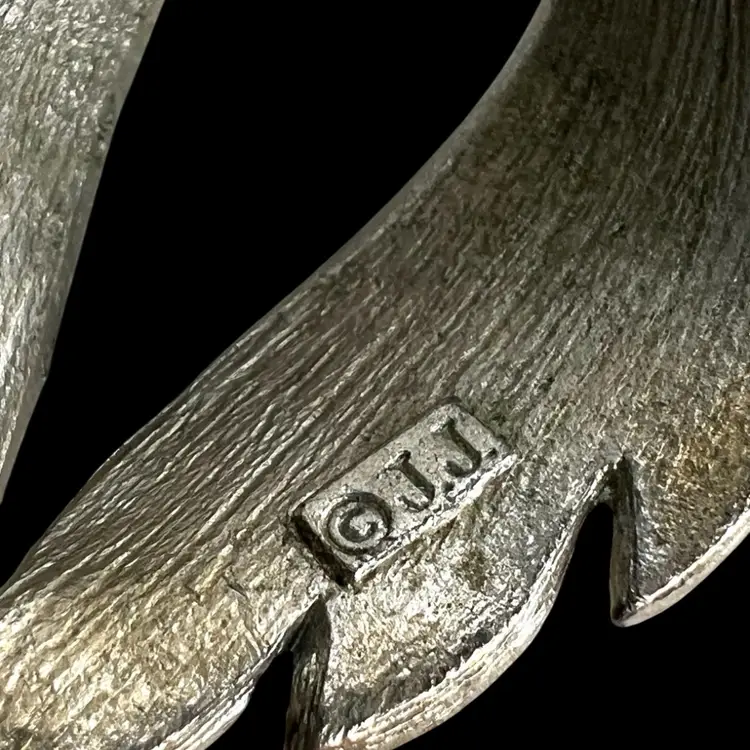 Vintage J.J. (Jonette Jewelry) brooch Feathered or Angel Wings Brooch Pin Silver-tone Metal Signed J.J. on back 1-7/8โ H x 1-3/4โ W Condition: Pin on back has loss of some silver coating, as seen in last photo; Good rollover safety clasp