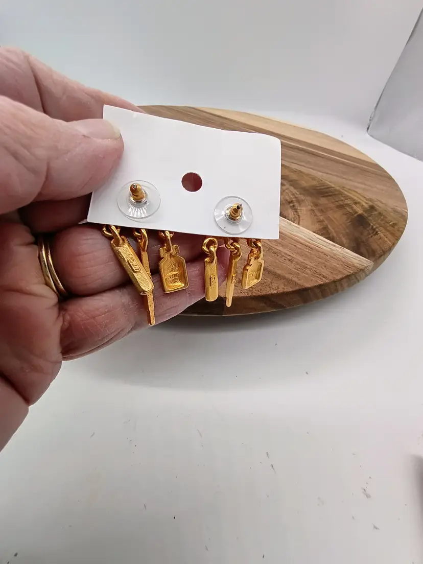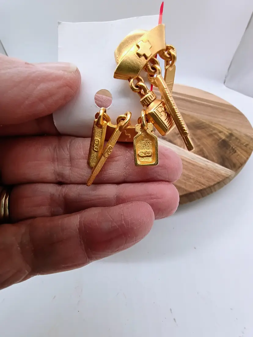 "JJ" Jonette Jewelry Gold Tone Nurse's Cap Pierced Dangling Charms Pierced Earrings. These are 1.75 inches long circa 1990's. These are preowned, no dents dings or warping. Each earring has have all dangle charms. The backs are present and cleaned. No color loss. Excellent condition. Ships USPS